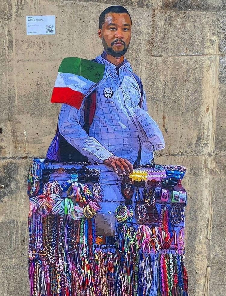 «In politica, saper vendere è un’arte. E c’è chi lo sa fare molto bene…». Matteo Salvini è il soggetto rappresentato nell’ultima opera dello street artist palermitano TvBoy, al secolo Salvatore Benintende. Matteo il vucumprà è il titolo dell’installazione artistica urbana, comparsa due giorni fa lungo via del Crocifisso a Taormina, in cui il leader della Lega è rappresentato nella vesti di un venditore ambulante con la pelle scura. Dal taschino della sua camicia azzurra a quadri a maniche lunghe fuoriesce una bandierina tricolore. In mano tiene un pannello a cui sono appesi braccialetti colorati, fermagli per i capelli e altre cianfrusaglie. «Salvini nero. Vabbé dai, non sono uscito nemmeno troppo male», ha commentato il segretario della Lega sulla sua pagina Facebook, approfittando per mettere nei commenti anche il link al suo profilo Instagram con l’invio alle persone a seguirlo anche su quell’altro social.