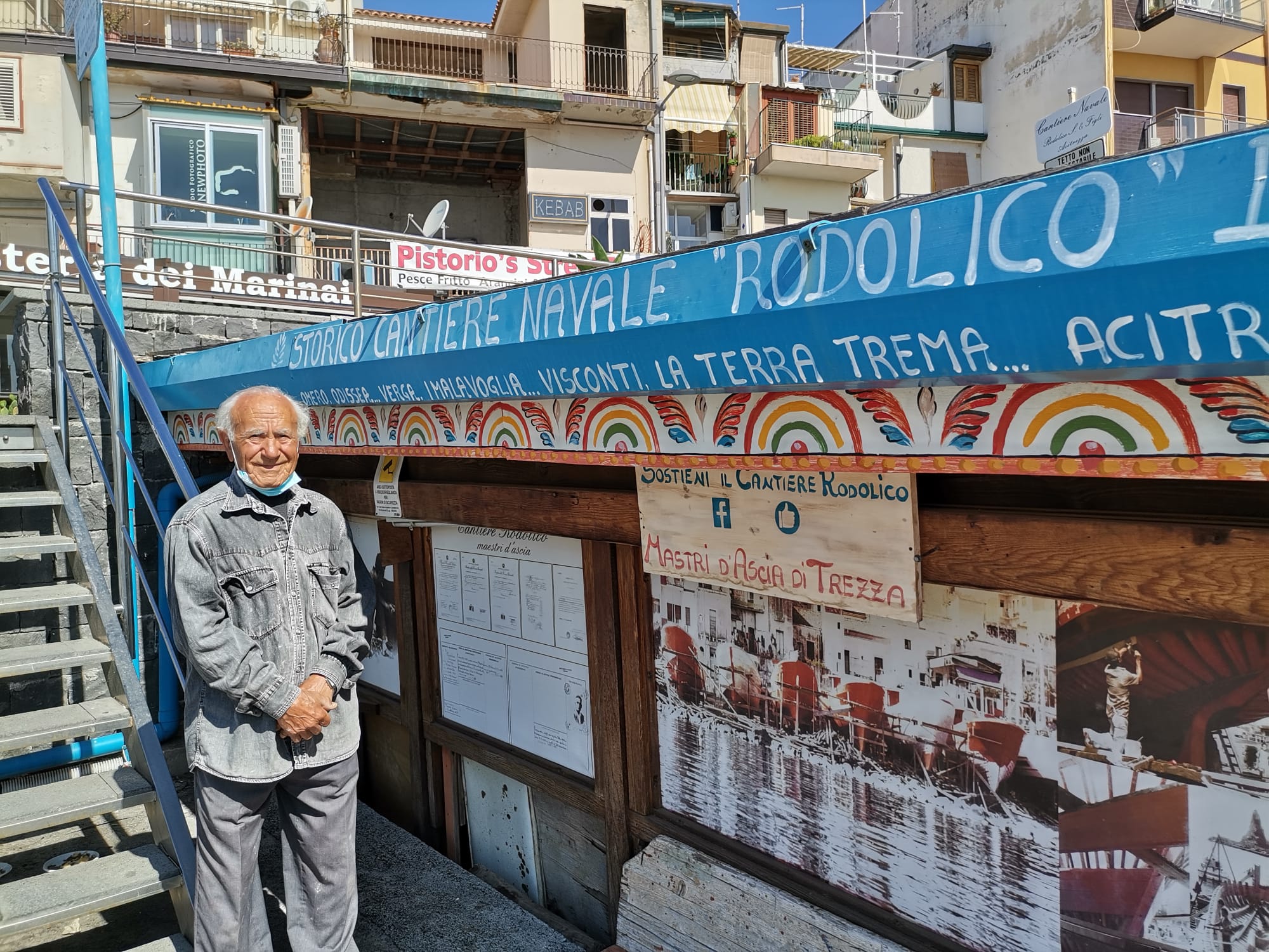 Una darsena nel cuore del lungomare di Acitrezza, con accanto una struttura seguita da segnaletiche colorate a indicare la presenza del cantiere. Accanto allo stabile, la cui finestra si affaccia sui faraglioni, c’è ancora lo scheletro di una piccola nave. Qui, Salvatore Rodolico, 84 anni, insieme ai suoi figli Giovanni e Nuccio, porta avanti il cantiere navale che ha ereditato dai suoi avi. Per lui, che è rimasto uno dei pochi maestri – o mastri – d’ascia esistenti, le giornate non sono più come quelle di una quarantina di anni fa, quando all’interno dello stabile oltre trenta persone realizzavano imbarcazioni che raggiungevano anche i 23 metri. Come la lunghezza dell’ultima opera – una motobarca – prodotta dai Rodolico nel 1991. Il cantiere è da più di 200 anni un simbolo del borgo dei I Malavoglia, tanto da comparire nel famoso romanzo del Verga. Per la sua maestria tramandata nel tempo, Salvatore Rodolico è considerato un patrimonio umano vivente. Riconoscimenti anche per il figlio Giovanni, che ha ricevuto gli onori da parte del presidente della repubblica Sergio Mattaerella. Mentre il cantiere è stato inserito nel registro dei beni immateriali della Regione siciliana.