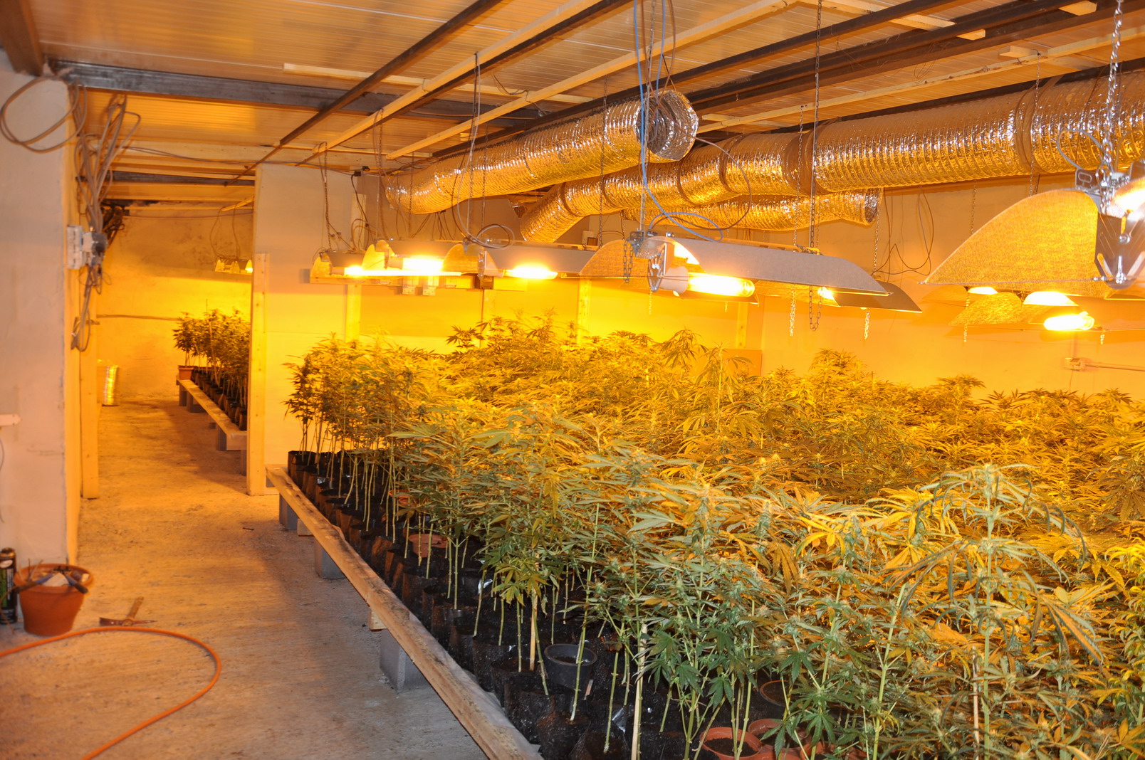 vero e proprio laboratorio industriale per la coltivazione intensiva di marijuana. Erano sei gli ambienti di coltivazione, tutti dotati di sistema di irrigazione e di aerazione, nonché di illuminazione con lampade alogene. Una strumentazione che serviva al mantenimento delle 2500 piante di skunk, un tipo pregiato di marijuana molto bassa e robusta, che i poliziotti hanno potuto osservare nella struttura. Il «laboratorio» era dotato di sistemi sofisticati per la produzione a livello industriale: sistemi di depurazione dell’acqua con l’osmosi inversa, timer, climatizzatori e stufe, fertilizzanti. Nonché aree adibite all’essiccazione e stagionatura.