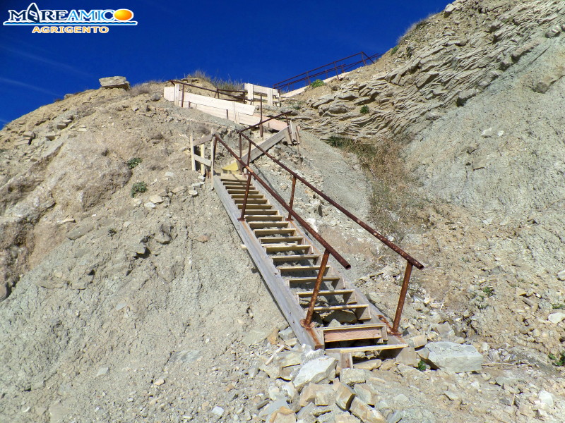 Una scala abusiva che collega un angolo di paradiso ad alcune case private in cima alla scogliera. Per arrivare a questo tratto di spiaggia in località Pietre cadute, tra Siculiana e Realmonte, in provincia di Agrigento, bisognerebbe fare una lunga passeggiata a piedi. Un tragitto che seleziona i visitatori e assicura l’unicità del sito.