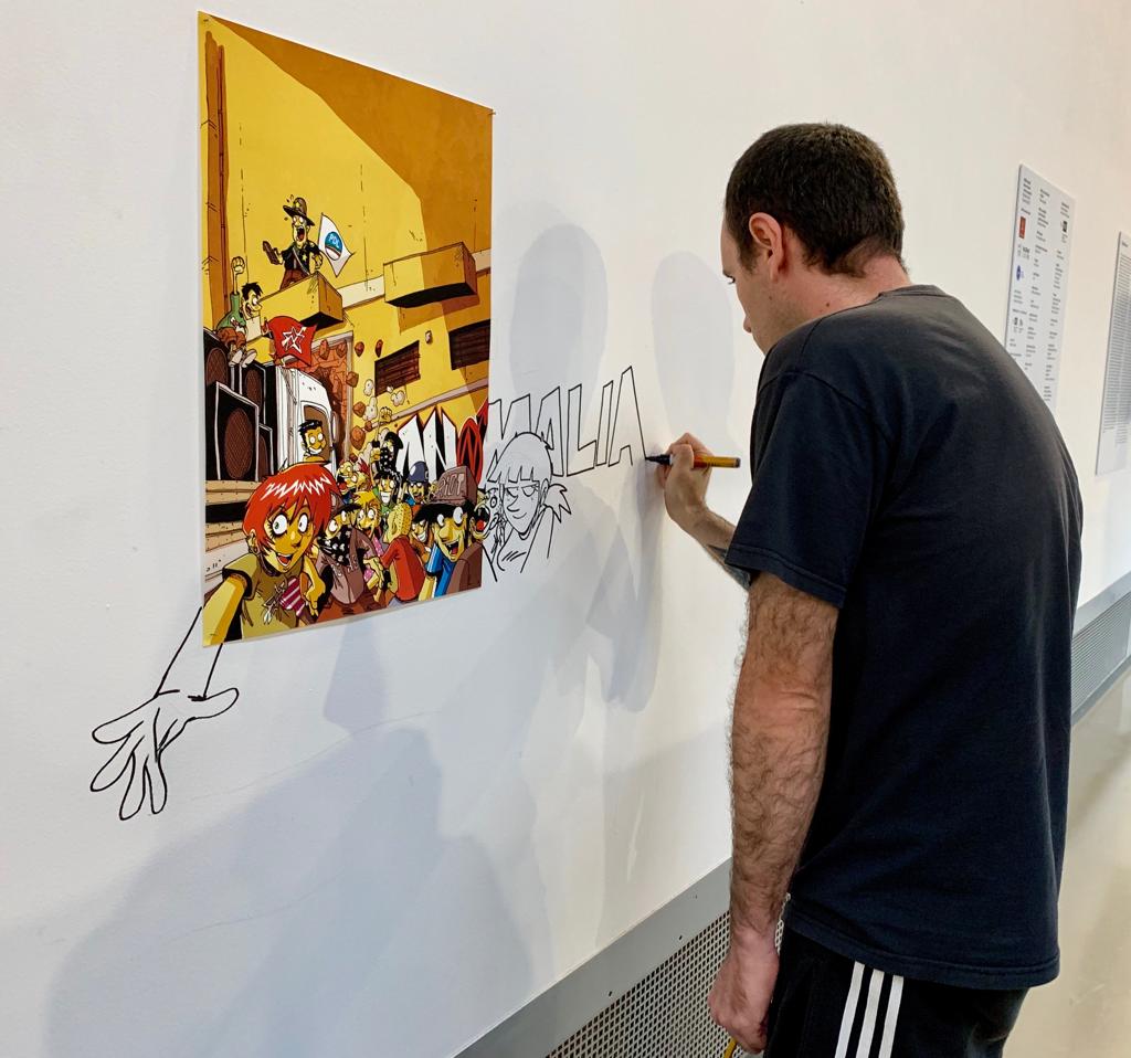Per la tappa palermitana Zerocalcare ha realizzato una specifica illustrazione, intitolata Stessa Barca, che è un omaggio alla diversità e sembra quasi avvolgere il visitatore, dando l’impressione di essere dentro un enorme fumetto. Rispetto a qualche anno fa l’artista romano, che proviene dalla scena dei centri sociali, sembra un po’ aver fatto pace con la celebrità e le lunghe file di fans che lo attorniano a ogni presentazione, chiedendogli quelli che lui definisce con autoironia disegnetti. Ma è rimasto tremendamente coerente, come conferma ogni angolo della mostra a lui dedicata. All’ingresso, ad esempio, si viene accolti da una scritta che lo stesso Zerocalcare ha realizzato questa mattina a sostegno del popolo curdo, proprio nei giorni dell’aggressione turca dopo la ritirata delle truppe Usa. Vicende che il disegnatore romano segue da tempo, e che ha documentato nel 2015 attraverso un lungo reportage pubblicato su Internazionale (e poi sul libro Kobane calling).