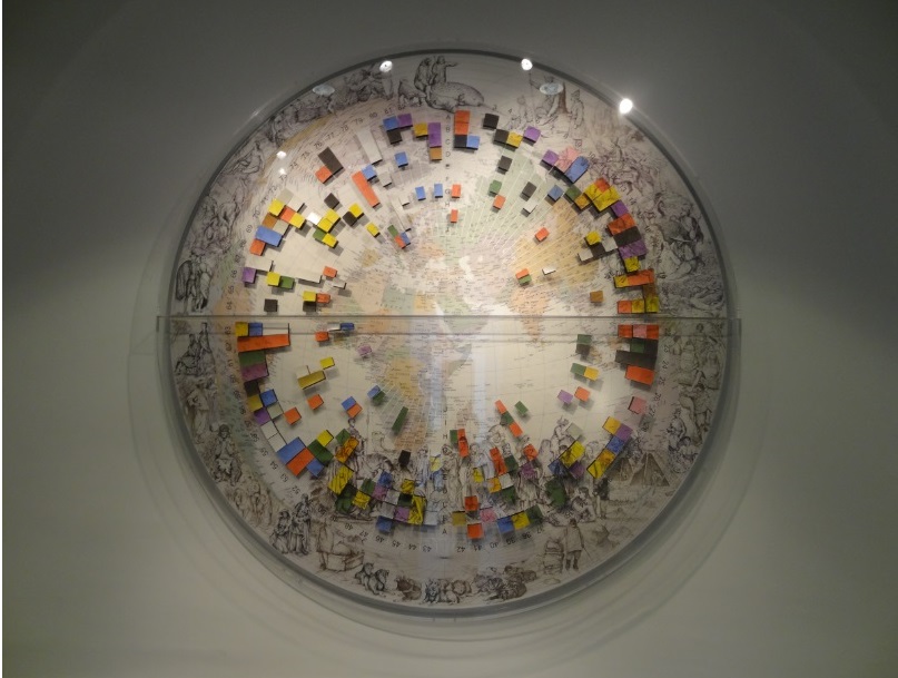 L’esposizione catanese si apre con l’opera del 2015 The Colours of Cultural Map, sulle differenze che uniscono i popoli, commissionata da Luciano Benetton per il progetto Imago Mundi. «Benetton chiede a migliaia di artisti di realizzare un piccolo quadro – spiega Ruffo – che poi viene esposto in giro per il mondo. Spesso il concetto di popolo è diverso dal concetto di nazione». Questo non vale per l’Italia sottolinea l’artista, ma altrove «i popoli sono spalmati su diverse nazioni o, al contrario, in una nazione coesistono diversi popoli». Nel lavoro di Ruffo sono rappresentati più di 90 popoli, disegnati a inchiostro, racchiusi in un cerchio cromatico che mette in luce come questi associno i colori a diversi sentimenti: paura, lutto, passione, integrità.