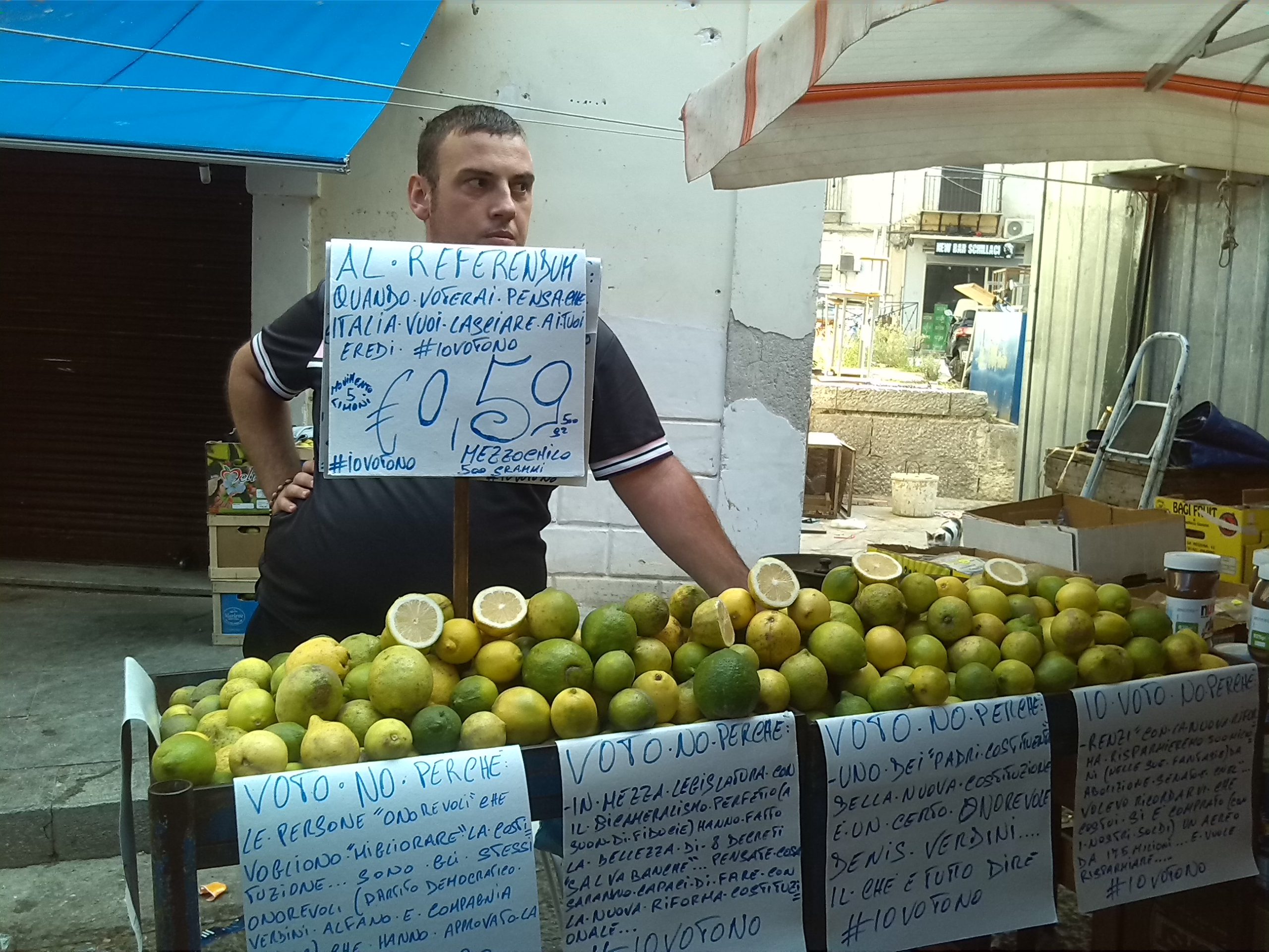 Accanto al cartello coi prezzi dei limoni da qualche giorno il venditore ambulante del centro storico espone i motivi per cui si scaglia contro la riforma della Carta voluta dal governo Renzi. Ricevendo consensi e critiche da numerosi esponenti politici. Mentre Marco Travaglio gli ha promesso una copia del suo ultimo libro