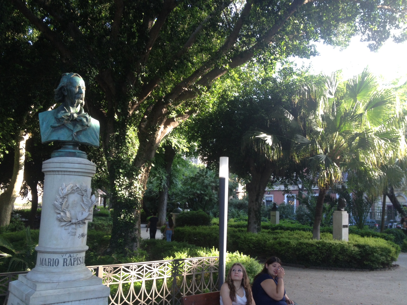 «Nel 1854, alla morte del principe Biscari, gli eredi lo vendettero al Comune», prosegue la spiegazione attraverso il viale degli uomini illustri. Nel gruppo di dieci persone c’è chi domanda dei costi e delle conseguenze di quell’atto di vendita, mentre qualcuno si ferma a scattare una fotografia al mezzobusto di Stesicoro, Luigi Capuana o Mario Rapisardi. Alcuni di questi monumenti hanno i segni dei pennarelli con i quali sono stati vandalizzati che si aggiungono alle tracce di deterioramento dovute alle intemperie. Poco dopo una fontana, un ragazzo del gruppo nota una nuova giostra per bambini. «C’è da poco, l’ha installata il Comune».