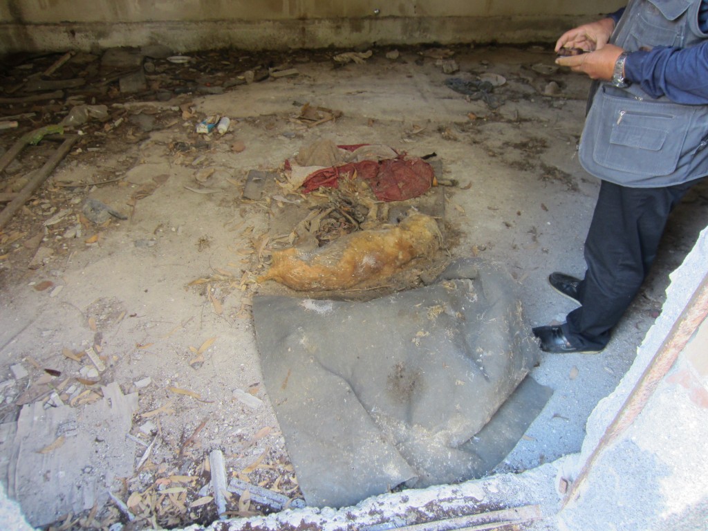 Al nostro arrivo, un meticcio bianco e nero scappa. Nei giorni precedenti, i ragazzi del softair ne hanno visti tre, prima di fare la macabra scoperta: tre teschi e numerose ossa spuntano tra le foglie nei locali che probabilmente una volta erano usati come stalle. «Cani ancora giovani a giudicare dalla dentatura», commentano gli attivisti di Teg4friends dopo il sopralluogo. Ma il peggio deve ancora venire. L’ingresso di una casupola viene liberato dal pannello di plastica che lo copre e un tanfo insopportabile annuncia la presenza di cinque carcasse in avanzato stato di decomposizione. Una di queste è avvolta dentro un tappeto. La stessa condizione di un altro cadavere, trovato dentro una stoffa in mezzo alla campagna poco più in là. «Sono morti da almeno un mese, sono quasi incartapecoriti», certifica il veterinario dell’Asp. Troppo tardi per accertare la causa del decesso. Nessuno di questi ha inoltre un microchip, grazie al quale sarebbe stato possibile risalire alla storia degli animali. Sommati agli scheletri rinvenuti nelle ex stalle, la stima è di otto cani morti.