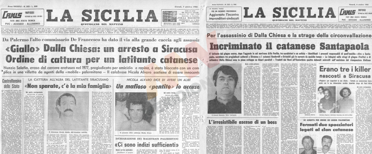 A chi e a cosa si riferiva il procuratore Carmelo Zuccaro durante la conferenza stampa della scorsa settimana? Con un lungo lavoro d’archivio, andando indietro fino al 1982, si arriva al 6 ottobre, un mese dopo l’uccisione del generale Carlo Alberto Dalla Chiesa. Nel calderone dell’inchiesta sugli esecutori spunta pure un catanese eccellente. Il Corriere della Sera mette nero su bianco il suo nome, il capomafia Nitto Santapaola, collegandolo all’arresto di Nicola Alvaro: «Apparterrebbe al gruppo del boss Santapaola, figura emergente del clan dei catanesi, ras dei guardaspalle di alcuni imprenditori». La Sicilia fa gli stessi nomi il giorno seguente, senza accostare il nome di Santapaola a Cosa Nostra: «Ordine di cattura per un latitante catanese», è il titolo. Il profilo del capomafia, già all’epoca accusato della strage della circonvallazione (16 giugno 1982, ndr) in cui venne ucciso il boss rivale Alfio Ferlito, viene pubblicato il giorno successivo, l’8 ottobre. Una foto in spalla sinistra fa da cornice all’approfondimento: «Incriminato il catanese Santapaola», è il titolo dell’edizione del giornale di Ciancio. La parola mafia compare solo quando si pone un interrogativo: «Catania città mafiosa? È ancora presto per dirlo anche perché la consistenza di questo fenomeno nuovo è tutto da accertare». Quando l’articolo viene pubblicato era già passato all’aldilà il boss Pippo Calderone e nel 1982 per le strade della città si contavano 62 morti ammazzati. Le domande vengono messe da parte sulle pagine del Corriere: «Nitto Santapaola, 43 anni, è l’uomo chiave della nuova mafia siciliana», scrive il corrispondente Antonio Ferrari. Alla fine la pista che avrebbe dovuto legare Santapaola all’omicidio Dalla Chiesa non si rivelerà corretta. Ma il profilo mafioso tracciato dal giornalista del Corsera sì.