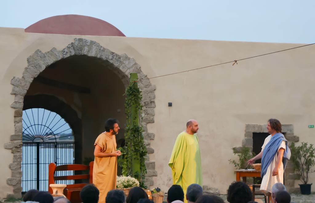 C’è l’acino bistrattato del Cataratto, che soffre a essere considerato un vino poco pregiato; c’è l’acino sborone e  un po’ facilone dello Zibibbo, ma innamorato della Sicilia; c’è l’acino lamentoso del Merlot, sempre pronto a chiedersi “ma com’è che un ci siddia”; e poi c’è il vitigno autonomo campano, dedito invece a truffe e truffarelle. Ed è a loro che si rivolge Gesù, insieme al suo discepolo prediletto Pietro, per fare una bella figura alle nozze di Cana dove trasformerà l’acqua in vino. Se non fosse che … È questa la trama della commedia brillante Il trapasso dell’acino in vino, interamente incentrata sulla più celebre bevanda alcolica. Tra ironia e sagacia il testo di Davide Ganci – al suo debutto come autore – mette in scena con un buon ritmo una comicità popolare che non risparmia qualche stilettata all’attualità.