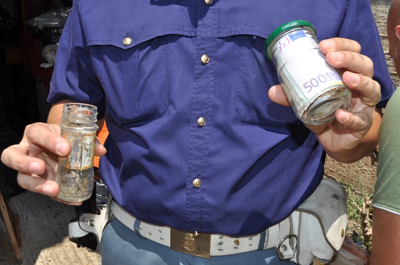 Durante alcune perquisizioni nella zona, l’attenzione dei poliziotti è stata attirata dalla strana disposizione delle piante, coltivate a una distanza giudicata anomala. Gli agenti hanno scavato il terreno scoprendo i due contenitori in vetro. Le banconote trovate sono tutte di grosso taglio; le cartucce sono di calibro 7.65.