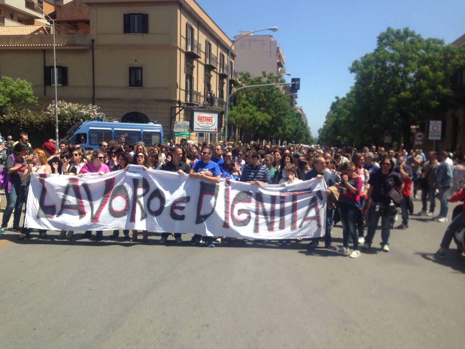 Prima giornata di sciopero per i lavoratori Almaviva e disagi per il traffico in via Marcellini. La manifestazione coincide con lo sciopero nazionale indetto da Cisalcom che comincia oggi e si concluderà giorno 22. A Palermo, sono scese in strada circa 350 persone. Il corteo si è diretto verso corso Calatafimi. «La Cisalcom ha permesso che i dipendenti Almaviva scendessero in piazza per protestare, proprio nel giorno in cui comincia il trasferimento di sede dei lavoratori impiegati nella commessa Sky», dice uno dei partecipanti allo sciopero. «Chiediamo di mantenere le condizioni contrattuali attuali, che vengano fermate le delocalizzazioni e lo stop alle commesse al ribasso».