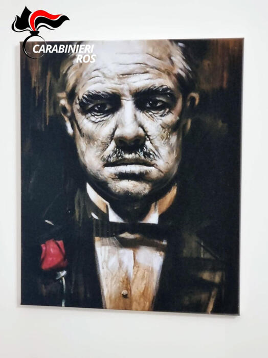 Nel primo covo di Matteo Messina Denaro perquisito dal Ros, a Campobello di Mazara, i carabinieri hanno trovato anche un poster con il volto de 'Il padrino', quello interpretato nell'omonimo film di Marlon Brando. L'immagine è una stampato in con il primo piano del padrino, che indossa il papillon e una rosa rossa alla sua destra, molto simile alla locandina del film di Francis Ford Coppola in cui il protagonista - Marlon Brnado appunto - interpreta il personaggio di don Vito Corleone. CARABINIERI +++ ANSA PROVIDES ACCESS TO THIS HANDOUT PHOTO TO BE USED SOLELY TO ILLUSTRATE NEWS REPORTING OR COMMENTARY ON THE FACTS OR EVENTS DEPICTED IN THIS IMAGE; NO ARCHIVING; NO LICENSING +++ NPK +++
