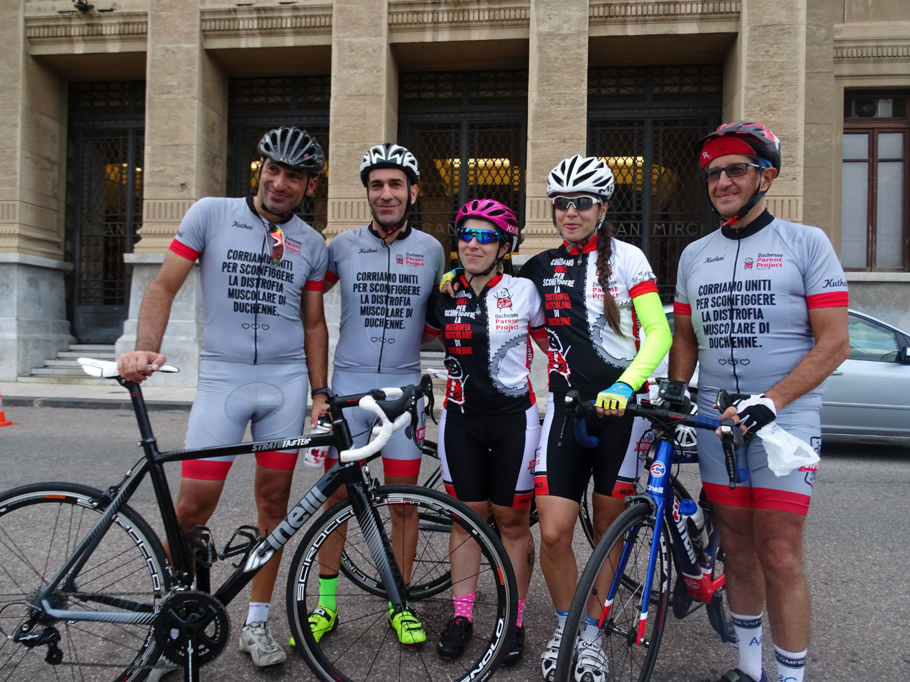 Per Maurizio, il papà di Edy, è stato naturale cogliere al balzo l’occasione delle due tappe siciliane del Giro d’Italia 2017 per creare una nuova iniziativa di sensibilizzazione. Quella di percorrere il tracciato della quinta tappa, da Pedara a Messina, in bicicletta indossando la maglia della battaglia contro la distrofia di Duchenne. Una simile idea non poteva non trovare terreno fertile nell’amico ciclista Valerio Capsoni e in 110+rpm, l’azienda catanese che da anni, grazie alla dedizione e passione dell’avvocato Marcello Marina, promuove il ciclismo nelle sue diverse declinazioni sportive e culturali. E proprio dalla sede di 110+rpm, che ha fornito a Maurizio Guanta e Valerio Capsoni delle nuovissime Cinelli Stratofaster per la prova, allungando di circa 15 chilometri il tracciato ufficiale, è partita, domenica 7 novembre, questa lunga pedalata di 150 chilometri con 3047 metri di dislivello attivo.
