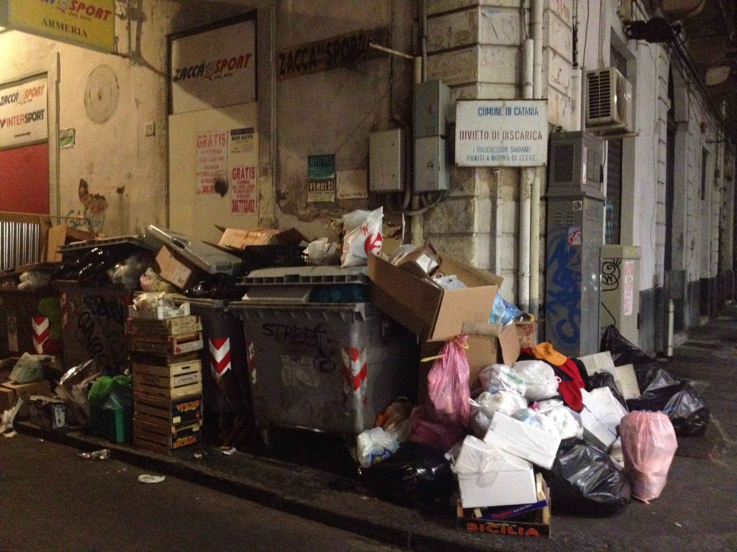 «Divieto di discarica. I trasgressori saranno puniti a norma di legge». Il suddetto monito è riportato in un pannello del Comune di Catania installato nell’angolo di strada in cui incrociano via Giuseppe De Felice e via Zaccà – Rosolia. Venti centimetri sotto il cartello comunale, in pieno centro storico, si raccoglie ogni sera «una quantità sproposita di spazzatura che conta anche i cosiddetti rifiuti ingombrati». A parlare è la cittadina etnea Serena Di Grazia. «Io e mio marito abitiamo da due anni in un appartamento che si trova a fianco della fila dei quattro cassonetti di raccolta. A volte non possiamo nemmeno aprire porte e finestre perché la casa si riempie di una puzza nauseabonda», racconta la cittadina. Che spiega come a fare le spese della «discarica a cielo aperto» siano proprio i cittadini. «Ogni mese dobbiamo comprare gli appositi prodotti per combattere i topi e le blatte richiamati dalla spazzatura», continua la donna. Che punta il dito contro l’inciviltà dei catanesi, i quali «quando trovano anche i bordi della strada pieni di munnizza non si fanno problemi a lasciare i sacchetti nelle scale delle abitazioni vicine», denuncia Di Grazia. Motivo per cui alcuni residenti del circondario hanno affisso sugli ingressi abitativi cartelli privati che recitano: «Si prega di non gettare immondizia. Grazie!».
