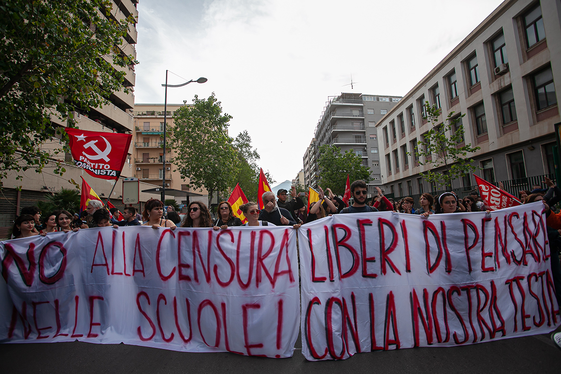 «Abbiamo da tempo avviato una raccolta firme e più in generale iniziative a sostegno di Lavinia, e ora siamo qui a sostegno di quest’altra professoressa palermitana – dice Donatella Anello, assistente amministrativa – perché sono il simbolo di una scuola che si vorrebbe far soccombere a una deriva reazionaria, dove i docenti dovrebbero essere solo strumenti per soffocare la libertà di pensiero degli studenti. Noi non ci stiamo: il licenziamento di Lavinia deve essere cancellato e la sospensione di Dell’Aria deve essere ritirata». Anche gli studenti del collettivo Umberto I chiedono l’immediata revoca del provvedimento disciplinare inflitto dall’ufficio scolastico provinciale. «Pensiamo che vivendo i luoghi della formazione – dice Ludovica – questi episodi siano preoccupanti perché ci fanno rendere conto che anche quello che dovrebbe essere il presidio del libero pensiero viene invece messo a rischio in nome di un rispetto delle istituzioni che invece in questo caso non esiste. All’interno delle scuole non dovrebbe esserci l’azzeramento del pensiero critico».