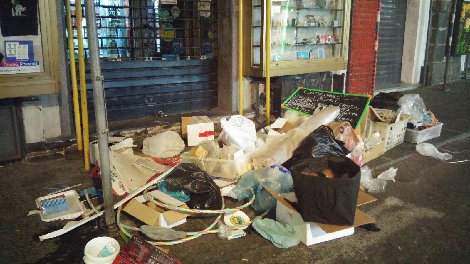 Nelle immagini, scattate nella tarda serata di ieri, si vede il marciapiede davanti a un noto bar di via Garibaldi. Brioches preconfezionate, scarti di cibo di ogni genere, scatole di cartone e altro materiale indifferenziato tutto mischiato insieme. «Uno schifo che – conferma la ragazza – continua nelle varie traverse della zona fino a piazza Duomo. In quello che tutti chiamano il “salotto di Catania” in realtà non c’è nessun tipo di controllo e residenti e turisti sono costretti a fare lo slalom fra la munnizza e a portarsi dietro una mascherina per i cattivi odori».