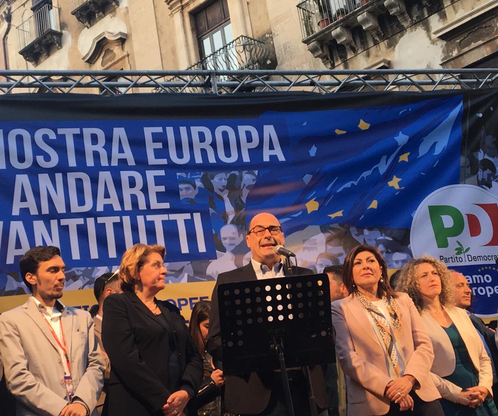 Sul palco ci sono alcuni dei candidati alle elezioni Europee: Caterina Chinnici, il medico di Lampedusa Pietro Bartolo, Michela Giuffrida e Virginia Puzzolo, l’unica di cui, nella piazza, circolano i volantini elettorali distribuiti dal suo staff. Nessuno, però, oltre il segretario prende parola. Molti lo guardano mentre parla e, in qualche momento, si accalora; tutti fanno cenni di consenso, applaudono. Tra la gente, in piazza, c’è anche l’ex presidente della Regione Rosario Crocetta. «Mi pare che la gente abbia voglia di pacificazione, che sia stufa del clima bellicoso – commenta – Io sono tornato dalla Tunisia per votare, ma non mi va di dire per chi. Dico solo che c’è aria di cambiamento e che questa lista può fare bene». Ad affiancare il segretario ci sono la senatrice Valeria Sudano, l’ex candidato sindaco di Catania e capo della comunità di Sant’Egidio Emiliano Abramo, il consigliere comunale Lanfranco Zappalà (e suo figlio), l’ex assessore etneo all’Ecologia Rosario D’Agata, l’ex vicepresidente del consiglio di amministrazione del Teatro Stabile Jacopo Torrisi e pezzi del Pd locale come Concetta Raia, Antony Distefano, Ersilia Severino, Angelo Villari.