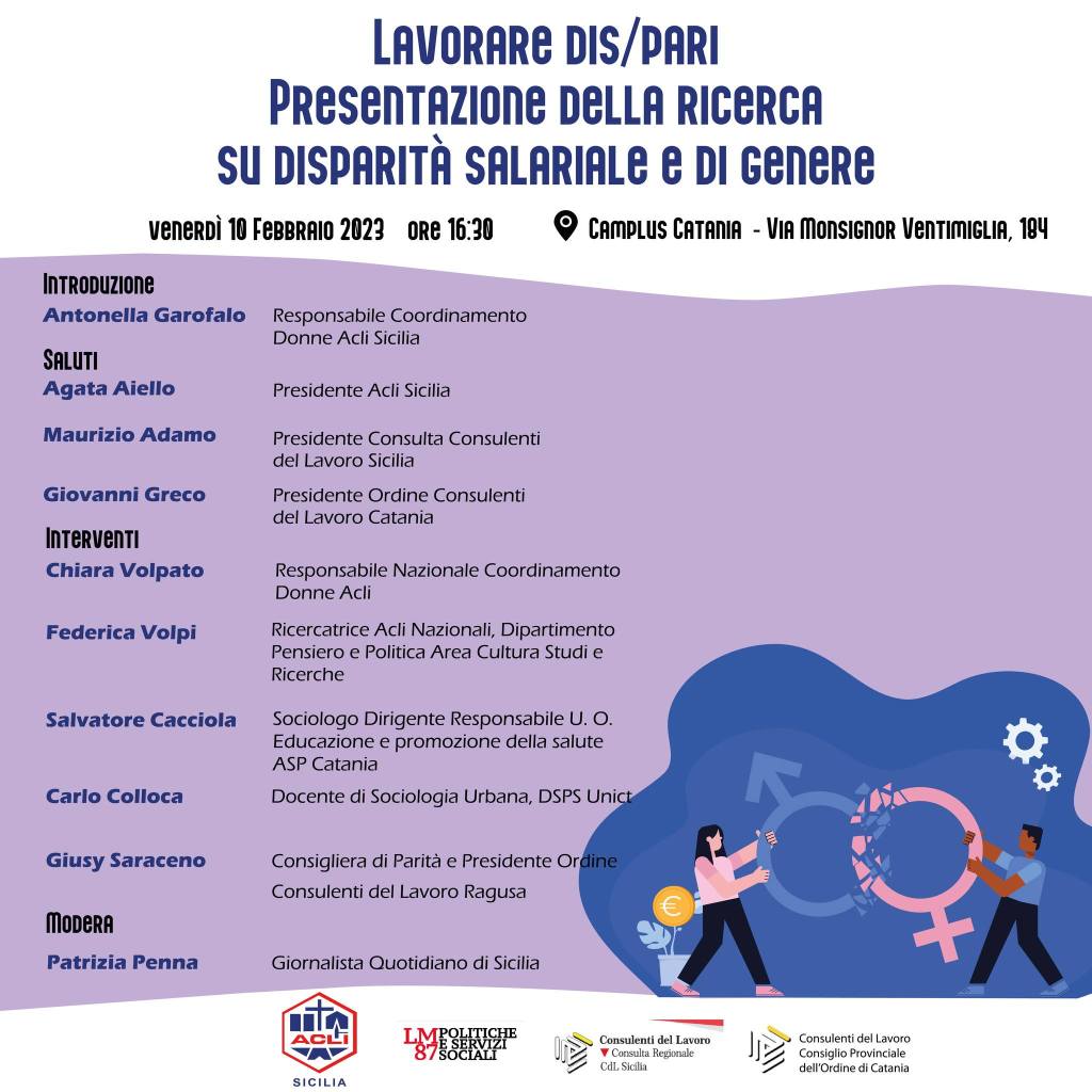 Il secondo incontro, dal titolo Lavorare dis/pari. Presentazione della ricerca sulla disparità salariale e di genere, si terrà nel pomeriggio di venerdì 10 febbraio alle16:30 e sarà un momento di confronto sul ruolo della donna nel mondo del lavoro durante il quale verrà presentata l’indagine Lavorare dis/pari, ricerca su disparità salariale e di genere realizzata dall’area lavoro delle Acli nazionali, in collaborazione con il coordinamento Donne Acli. Tra gli interventi in programma ci sono: Antonella Garofalo (responsabile coordinamento Donne Acli Catania); Maurizio Adamo (presidente dell’ordine dei Consulenti del lavoro Sicilia); Giovanni Greco (presidente dell’ordine dei Consulenti del lavoro Catania); Chiara Volpato (responsabile nazionale del coordinamento Donne Acli); Federica Volpi (ricercatrice Acli nazionali); Salvatore Cacciola (responsabile educazione e promozione alla salute dell’Asp di Catania); Carlo Colloca (docente di Sociologia Urbana di Unict); Giusy Saraceno (consigliera di parità e presidente dell’ordine dei consulenti del lavoro Ragusa). Modera l’incontro la giornalista del Quotidiano di Sicilia Patrizia Penna.