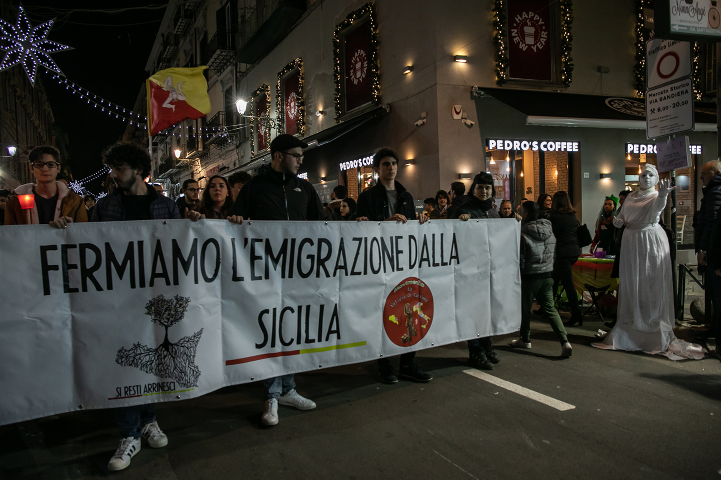 Una cinquantina di fiaccole del movimento Si resti, arrinesci hanno acceso la luce sul problema di chi è costretto dalla necessità ad abbandonare la Sicilia, coinvolgendo le persone di rientro a casa per le feste natalizie
