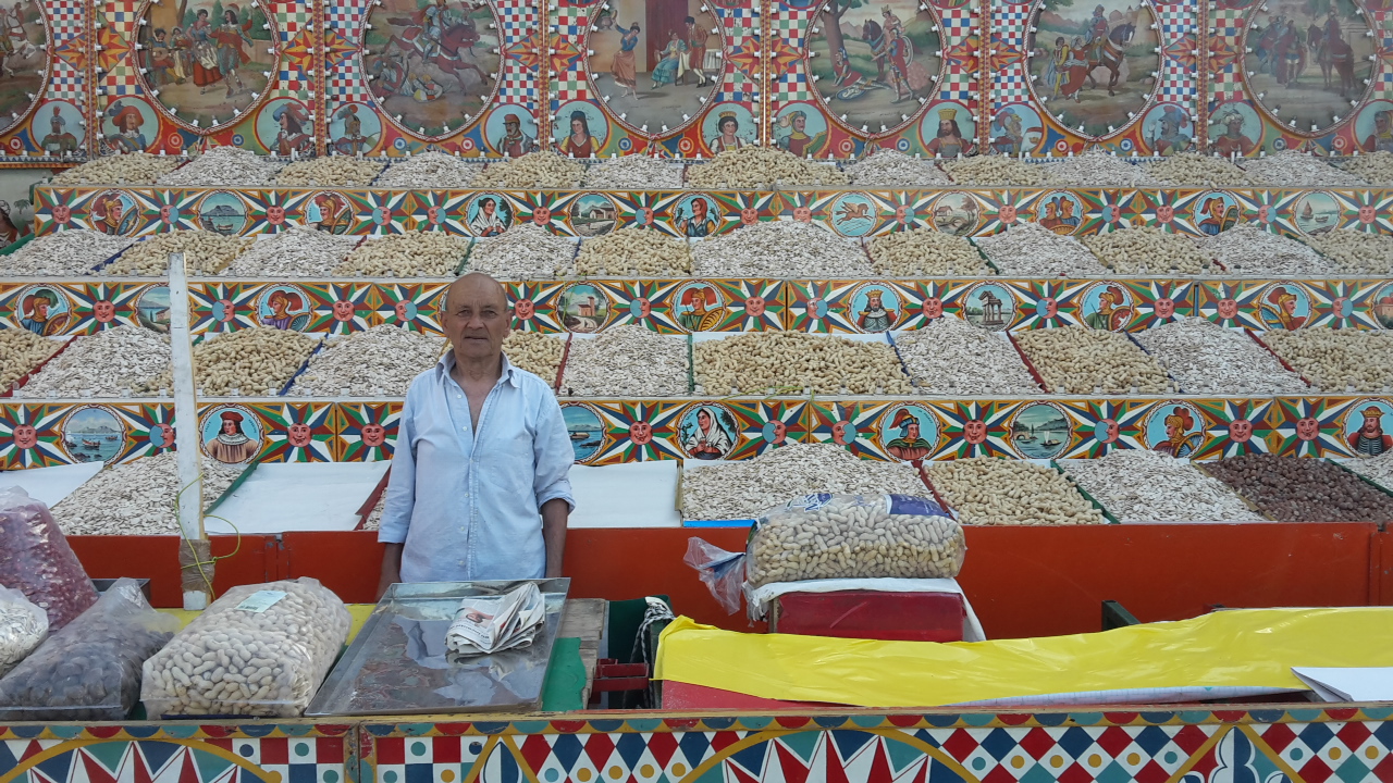 Santi e Paladini della tradizione che una volta era tipico vedere disegnati sulle bancarelle, soprattutto in periodo di festa. «Molti erano i banchi dipinti una volta, – racconta il signor Giuseppe – ma ormai rimane solo il mio; un tempo però era almeno tre volte più grande, un vero e proprio monumento. Sono 70 anni che faccio questo mestiere: da quando a 12 anni andavo con mio padre a vendere calia e simenza e prima di lui mio nonno aveva già un carretto».
