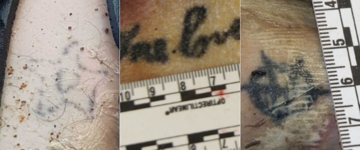 Il primo corpo, quando viene ritrovato ha addosso solo gli slip e la parte superiore della muta; il secondo cadavere indossa una muta intera, la canottiera, i calzini e le scarpe da ginnastica; anche il terzo corpo ha addosso una muta da sub della stessa marca (Aqua Lung) di quella indossata dal primo cadavere e anche lui ha una canottiera e dei calzini. Sui loro corpi nessun segno di violenza. «I miei figli indossavano la muta perché la nostra è una famiglia di pescatori e loro si vestivano così quando andavano per mare». La donna li avrebbe riconosciuti dai grossolani tatuaggi rimasti incisi sulla loro pelle, protetti proprio dalle mute che indossavano: la sagoma di un pipistrello – che somiglia al simbolo di Batman – con all’interno delle ali due ghirigori, una lettera emme che sembra la rappresentazione grafica del segno zodiacale dello Scorpione, un disegno tribale composto da una striscia con all’interno dei triangolini, la scritta in inglese One love e una A di anarchia inscritta dentro a un cerchio.