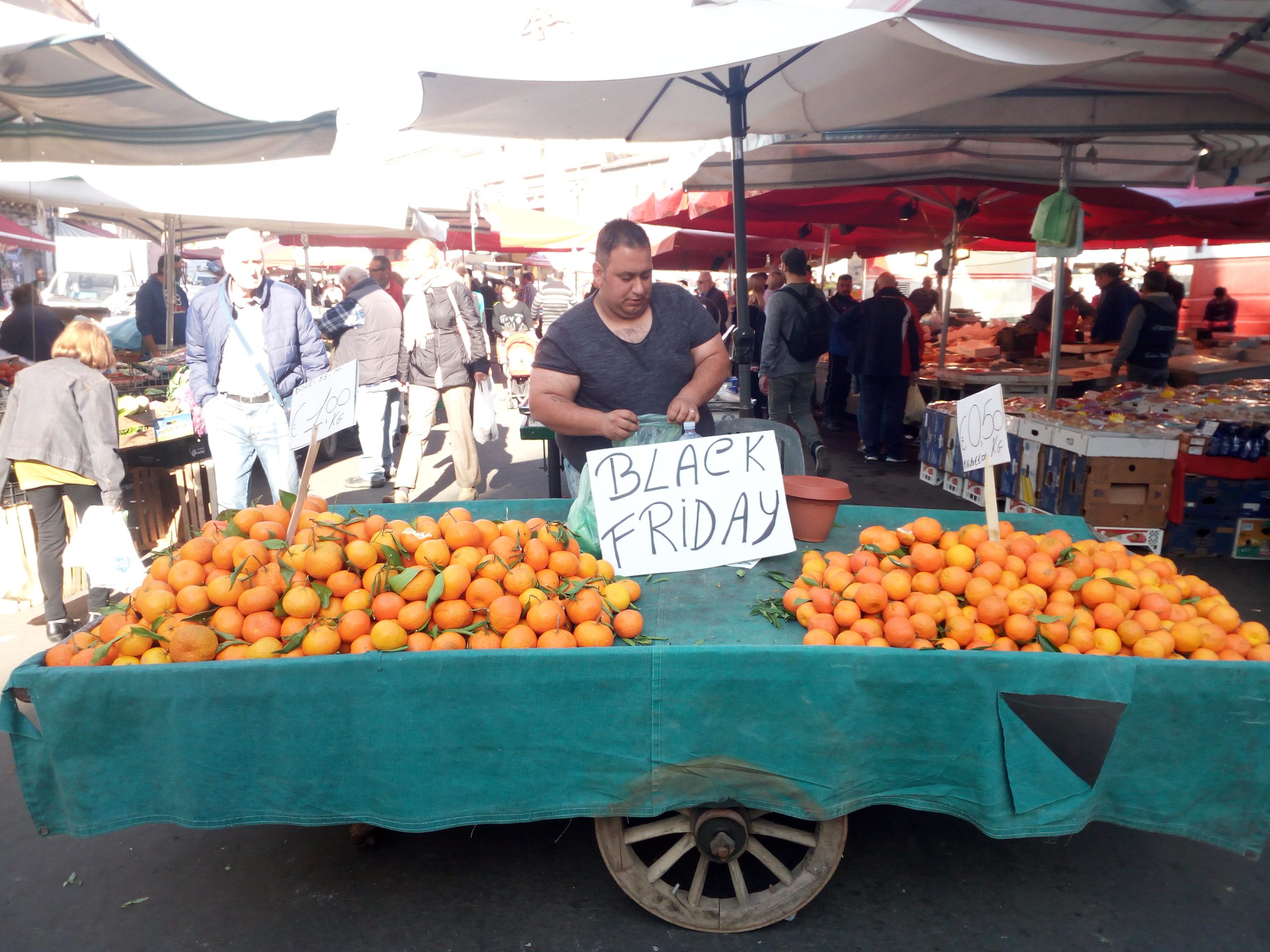Giunge domani il giorno tanto atteso da chi vuole iniziare a cimentarsi negli acquisti natalizi, usufruendo delle convenienti offerte lanciate in occasione del celebre Black Friday, il venerdì nero mutuato dagli Stati Uniti. Tradizione commerciale che segue il giorno del Ringraziamento e che ha ormai abbondantemente preso piede anche in Italia. A Catania non sono solo le vetrine di Via Etnea e Corso Italia ad annunciare l’arrivo della giornata più vantaggiosa dell’anno, ma anche la bancarella di un fruttivendolo della fera ‘o luni, in piazza Carlo Alberto. Tra i suoi mandarini e le arance, in vendita a prezzi ribassati, è spuntato il famigerato cartello: Black Friday. Stiamo parlando di Salvo Cinturino, giovane venditore ambulante noto ai catanesi e di gran fama sui social network per le sue efficaci doti comunicative. «Salvo è un grande comunicatore», commenta a tal proposito una passante intenta a fare spese.