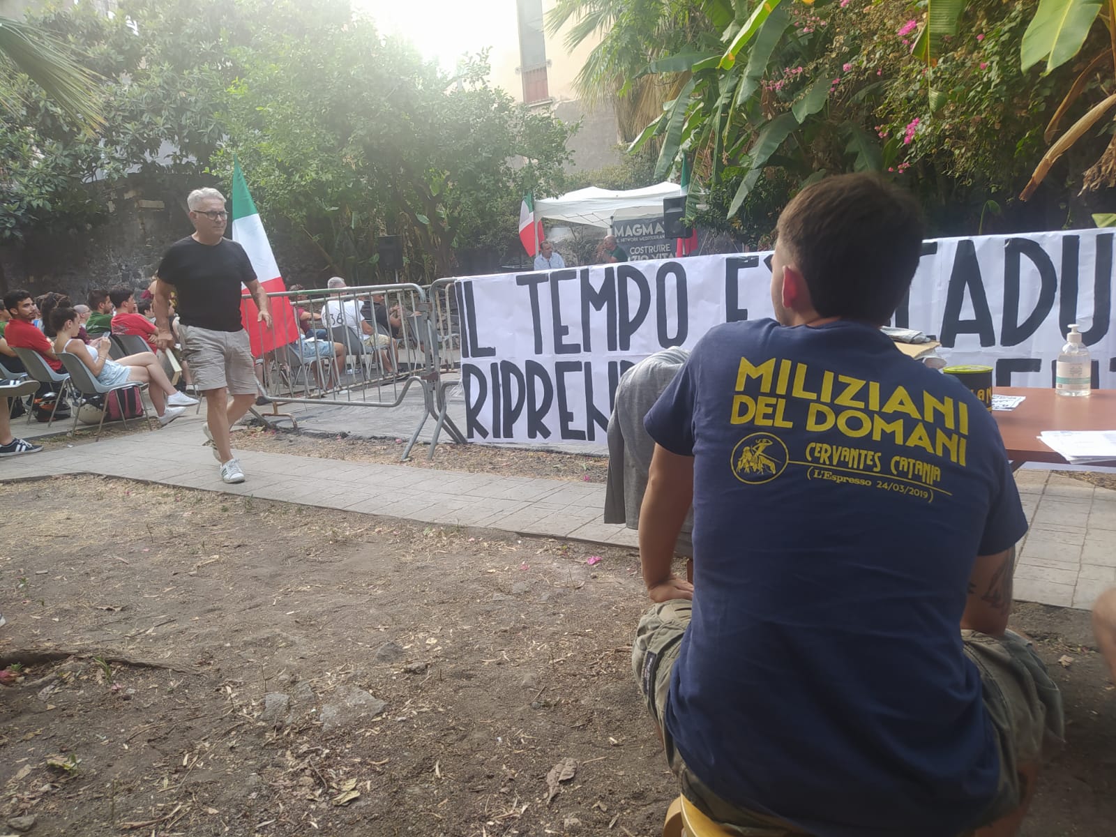 A differenza degli anni passati in cui sindaci e assessori presenziavano alla manifestazione, quest’anno – almeno nella giornata di sabato – nell’ex caserma occupata non si è registrata la presenza di veterani con cariche politiche. Tuttavia ci sono i fondatori di Cervantes Stefano Di Domenico, che ha militato per diverso tempo nella Lega come dirigente, e Alberto Pappalardo. Tra i giovani, invece, spiccano le presenze di Giordano Argento, segretario della consulta giovanile a Gravina in quota Lega e quelle di Fabio Roscani e Simone Granata, entrambi di Gioventù nazionale. Il primo nelle vesti di presidente intervistato, il secondo nel ruolo di moderatore dell’incontro dal titolo L’opposizione della gioventù europea contro i burocrati di Bruxelles. Ospite d’onore il deputato europeo Vincenzo Sofo. «L’Unione europea è un puzzle di paesi con una diversità di visione», dice Sofo interpellato da Granata. «E il Covid – aggiunge – ha palesato tutte le problematiche del sistema globalizzato e del modello di delocalizzazione».