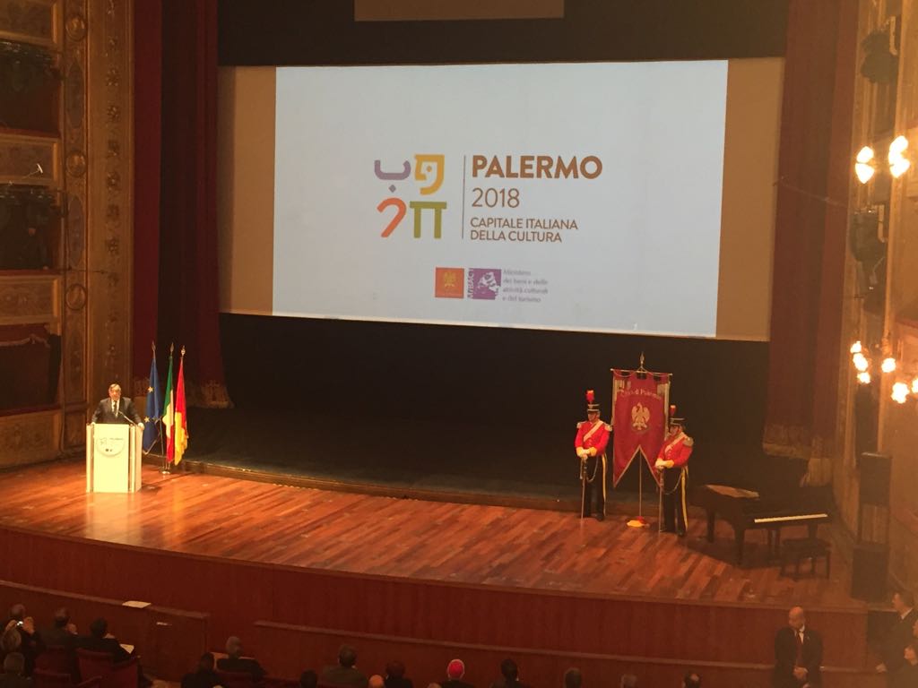 Prende forma l’anno di Palermo Capitale della cultura. Stamattina la cerimonia di presentazione in grande stile al Teatro Massimo. Antipasto alla Sala Onu con il governatore Nello Musumeci, il sindaco Leoluca Orlando e l’assessore comunale alla Cultura Andrea Cusumano. In Sala Grande, poi, gli interventi del ministro della Cultura Dario Franceschini e del premier Paolo Gentiloni, con lo svelamento del logo e il lancio del sito, operativo da mezzanotte. La cerimonia è stata aperta dall’Inno di Mameli intonato dalle Voci Bianche e dal coro Arcobaleno del Massimo. Presenti decine di sindaci, autorità civili, militari e religiose e l’assessore regionale ai Beni Culturali Vittorio Sgarbi.