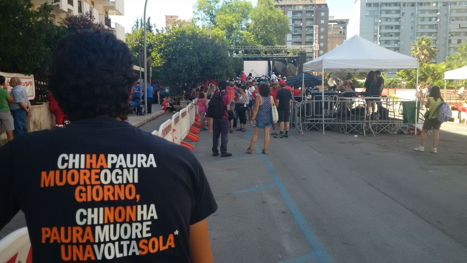 Tanti gli slogan che si possono leggere sugli striscioni, come «ricordare ci rende consapevoli, forti, ma solo agire ci rende simili», oppure «via D’Amelio strage di Strato». E poi decine le magliette e i cappellini rossi che ricordano le stragi del ’92. Su questi, ancora altri slogan: «la mafia uccide, l’indifferenza pure», «un giorno questa terra diventerà bellissima», e ancora «le loro idee camminano sulle nostre gambe» e «mai più trattative Stato-mafia». Presenti tra gli altri, il fratello del giudice Paolo e leader del movimento Agende Rosse, Salvatore Borsellino, il sindaco di Napoli Luigi De Magistris, il primo cittadino di Messina, Renato Accorinti, e quello di Palermo Leoluca Orlando, che hanno preso in braccio proprio Salvatore Borsellino. Sul palco allestito in via D’Amelio le testimonianze di vita e di impegno e l’orchestra dell’istituto comprensivo di Ficarazzi.