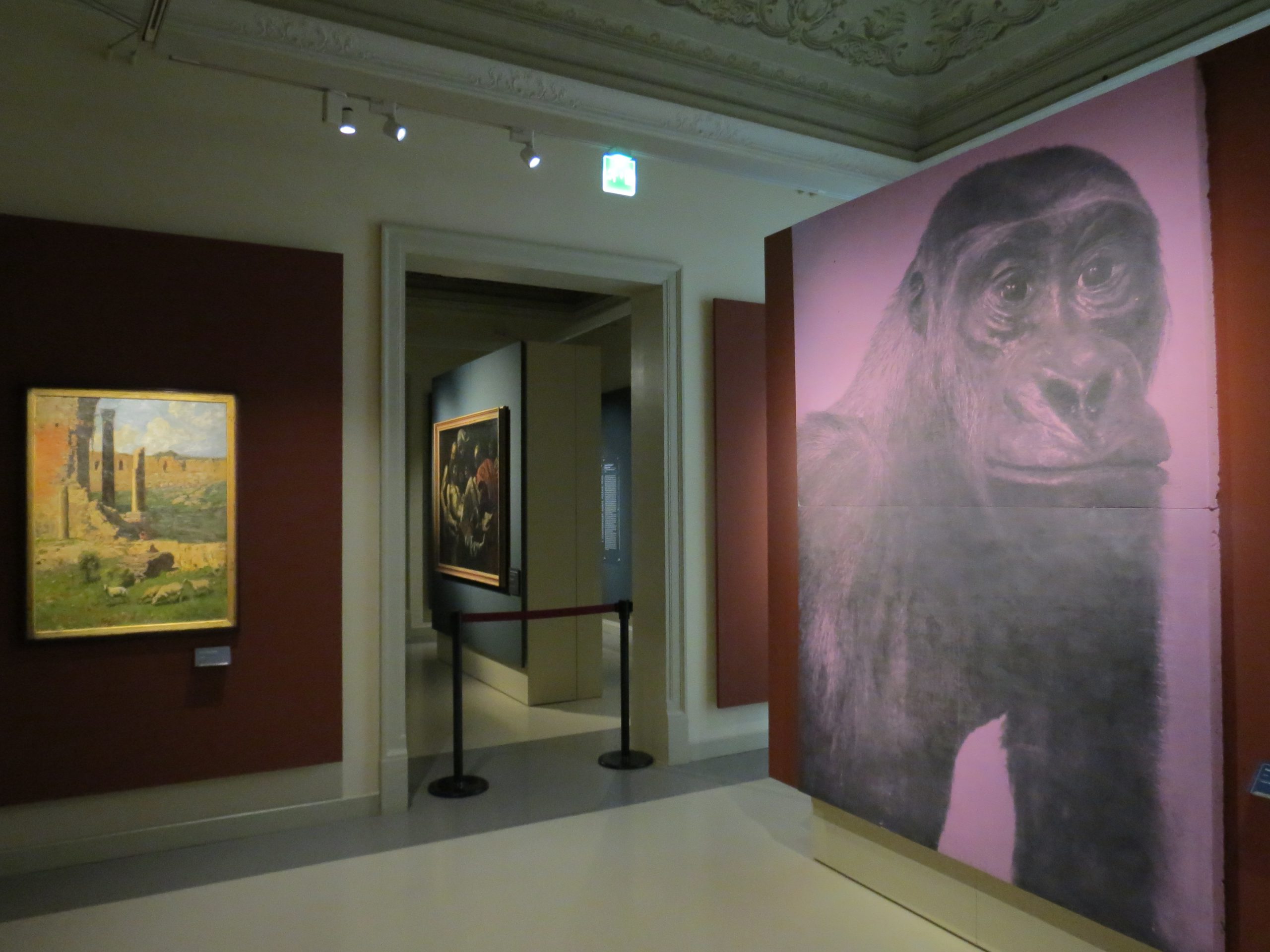 Tra i paesaggi di Catti e Cortegiani, risaltano le sculture in lattice di Franzella, che della pietra fanno un arazzo e delle medaglie blocchi di cemento. Pittura, scultura e fotografia contemporanea entrano in armonioso contrasto con le opere della Fondazione, in una mostra che richiede al visitatore un’osservazione attenta e paziente. La Mattanza di Leto trova il suo sangue in un trapezio, rondini in volo in un affresco digitale che con un’inquadratura dal basso rimandano al Paesaggio sull’Appennino, pali del telegrafo che dipinti diventano saltatori in stampe su cemento e ancora Primate tra i templi di Agrigento nella stanza dell’origine della cultura e della specie.