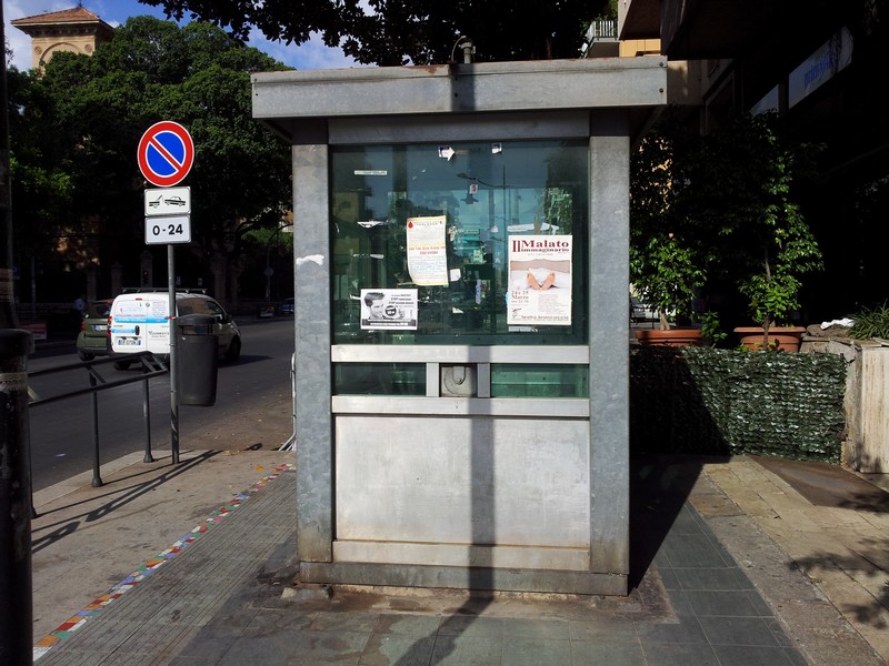 Al contrario del suo illustre compagno di marciapiede, il ficus che da 25 anni ospita messaggi d’amore, di vita e di speranza lasciati da tante mani diverse, la garitta si erge arrugginita, impolverata, abbandonata e coperta da vario materiale pubblicitario, al pari di un palo dell’illuminazione o di un armadio di servizio per telefonia o elettricità. Eppure il fatto che la struttura non sia stata rimossa – a circa 30 anni dalla sua collocazione e a cinque lustri dal suo pensionamento – non è il frutto del solito immobilismo parolaio che spesso caratterizza le istituzioni nel noto gioco dello scaricabarile di responsabilità.