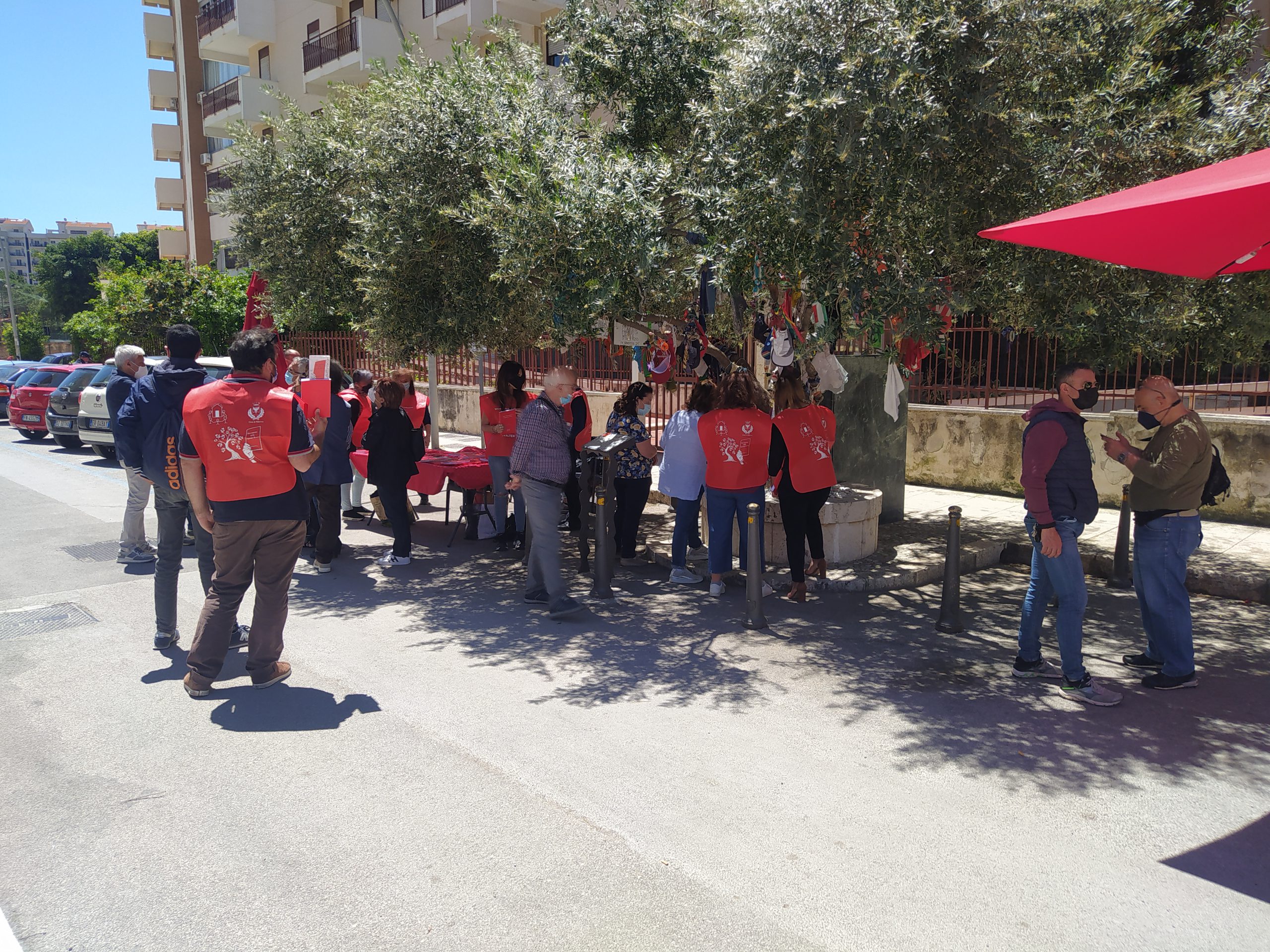 Paolo, Agostino, Claudio, Emanuela, Vincenzo, Walter. Sono i nomi degli agenti della scorta del giudice Borsellino impressi a caratteri cubitali nelle pettorine rosse (per richiamare il colore dell’agenda del giudice sparita subito dopo l’attentato di via D’Amelio) dei volontari posti a presidio dell’albero della pace. Ovvero l’albero di ulivo piantumato il 19 luglio del 1993 nella buca formatasi a seguito dell’esplosione della Fiat 126, per iniziativa di Maria Pia Lepanto, la madre del giudice. Nei ciottoli che circondano l’aiuola si possono leggere i nomi di chi, passando da lì ha voluto lasciare una traccia. Davanti all’albero c’è il banchetto allestito dai volontari della Scorta per la memoria, persone di ogni età e da tutte le parti di Italia: c’è chi arriva da Palermo, chi da Catania e chi dalla Campania. Ognuno con la sua storia, ognuno con i suoi ideali. Dalle stragi alla politica, passando dalla magistratura, gli argomenti sono tanti. Nel mirino c’è anche lo Stato. «Come si fa ad abbandonare le famiglie delle vittime di attentati di mafia?», si chiedono gli attivisti. Come Graziella Accetta, madre del piccolo Claudio Domino ucciso con un colpo di pistola alla testa il 7 ottobre del 1986. Anche lei presente alla mobilitazione per chiedere giustizia dopo 35 anni in cui non è ancora emersa una verità e un colpevole.