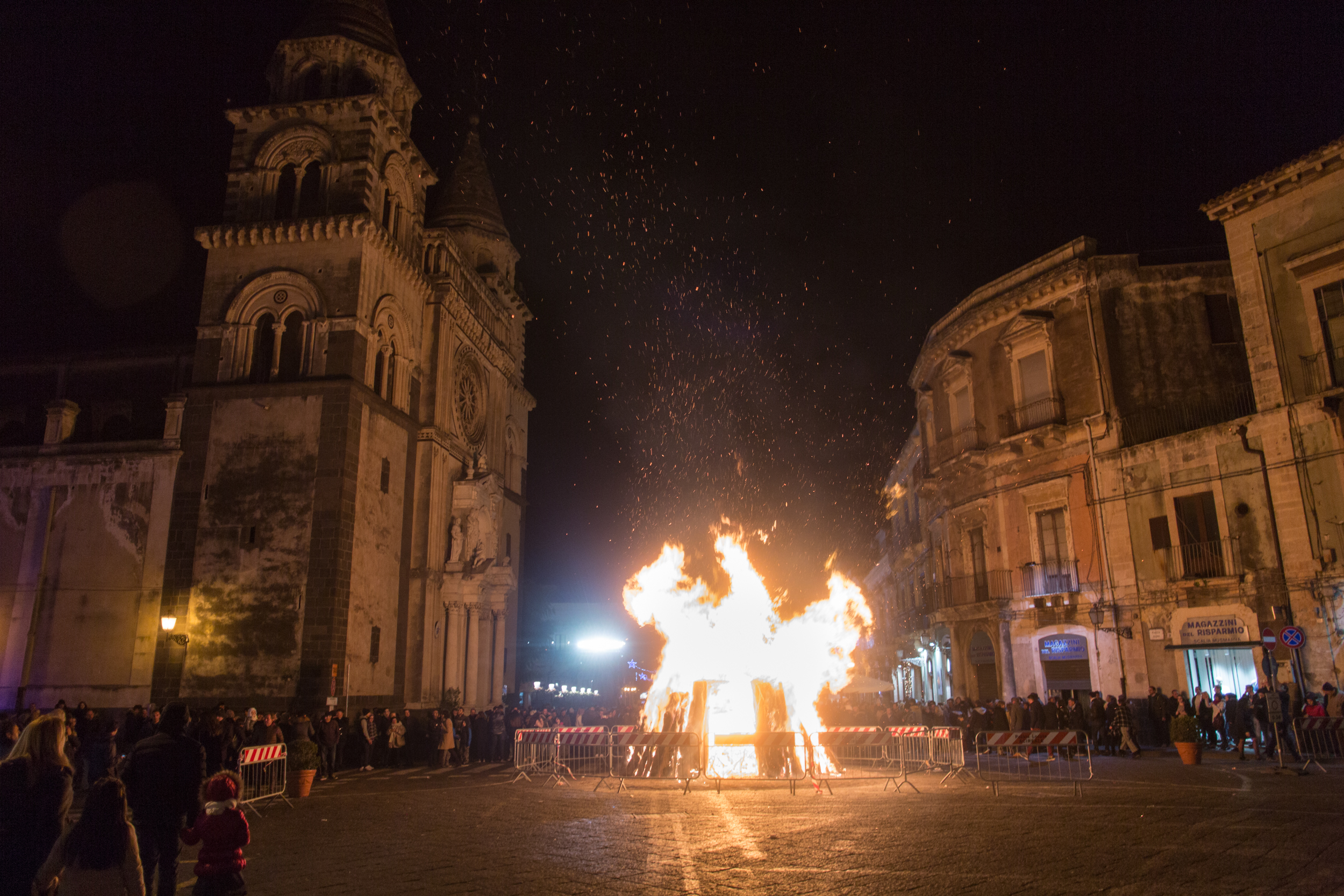«Perché siete venuti a vedere il ceppo?», chiediamo ai presenti. «È tradizione», risponde la maggior parte di loro. Una coppia porta per la prima volta il figlio, prima di tornare al Nord per lavoro. Chi, invece, è nato fuori dalla Sicilia osserva la scena per la prima volta. Un signore, vicino al fuoco, dà l’idea di conoscere bene la pratica: gira tutti quelli della zona, spiega. Di solito va anche a Giarre, ma quest’anno gli è giunta voce che sia quasi spento e non ci sia molto da vedere. Forse salta.
