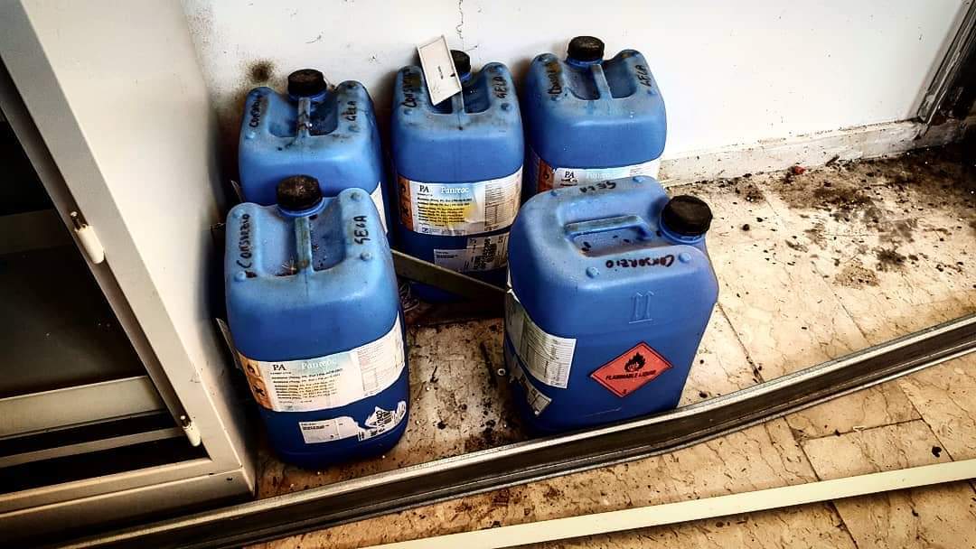 Muovendosi all’interno della struttura la devastazione è evidente. Infissi, sanitari e impianti elettrici sono stati asportati o danneggiati, ma è all’interno dei laboratori che i segni del passaggio dei vandali sono ancora più evidenti. I macchinari sopravvissuti sono davvero pochi. Tra questi uno spettroscopio ad assorbimento atomico. Un pezzo unico dal valore di diverse centinaia di migliaia di euro che serve per la determinazione sia quantitativa sia qualitativa di ioni metallici in soluzione. Probabilmente non è stato portato via perché troppo pesante. Ma la situazione più inquietante si trova nel magazzino dove venivano stoccati i prodotti chimici. Qui, all’interno di due armadi sventrati, ci sono decine di reagenti di ogni tipo. Accanto all’armadio poi, bidoni di solvente altamente infiammabile, ancora pieni.