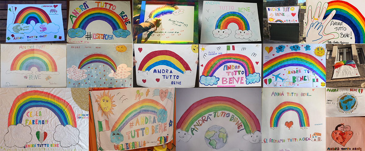 Lenzuoli, cartelloni, lavagnette, pezzi di stoffa bianca, cartorcini o anche semplici fogli di carta. In questi giorni, tutto può fare da sfondo agli arcobaleni colorati sui quali campeggia la scritta Andrà tutto bene. «Ogni famiglia dovrebbe disegnare un arcobaleno su un cartellone o un lenzuolo, con la scritta “tutto andrà bene” per poi appenderlo su finestre, balconi o terrazze». È questo il contenuto di un messaggio che invita a una sorta di flash mob a distanza organizzato da balconi, finestre e terrazze di tutta Italia per non disattendere l’appello del governo a restare a casa in questi giorni di emergenza per la diffusione del nuovo coronavirus.