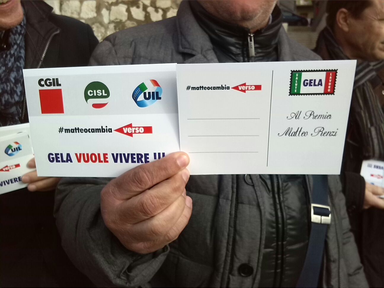 Alla stampa poi è stata annunciata la prossima iniziativa dei confederali. Ovvero centomila cartoline già stampate e da far firmare alla popolazione non solo di Gela ma del comprensorio per poi mandarle al presidente del consiglio. #Matteocambiaverso è il messaggio inviato, che riprende un celebre slogan di una campagna pubblicitaria del premier. Si potrà firmare in tutti i presidi rimasti: al centro Oli, al Comune e sulla collegamento per Caltanissetta. Previsti anche dei gazebo in piazza Umberto I. Tra i presenti qualcuno suggerisce già una possibile dedica: «Mattei costruisce, Matteo distrugge».