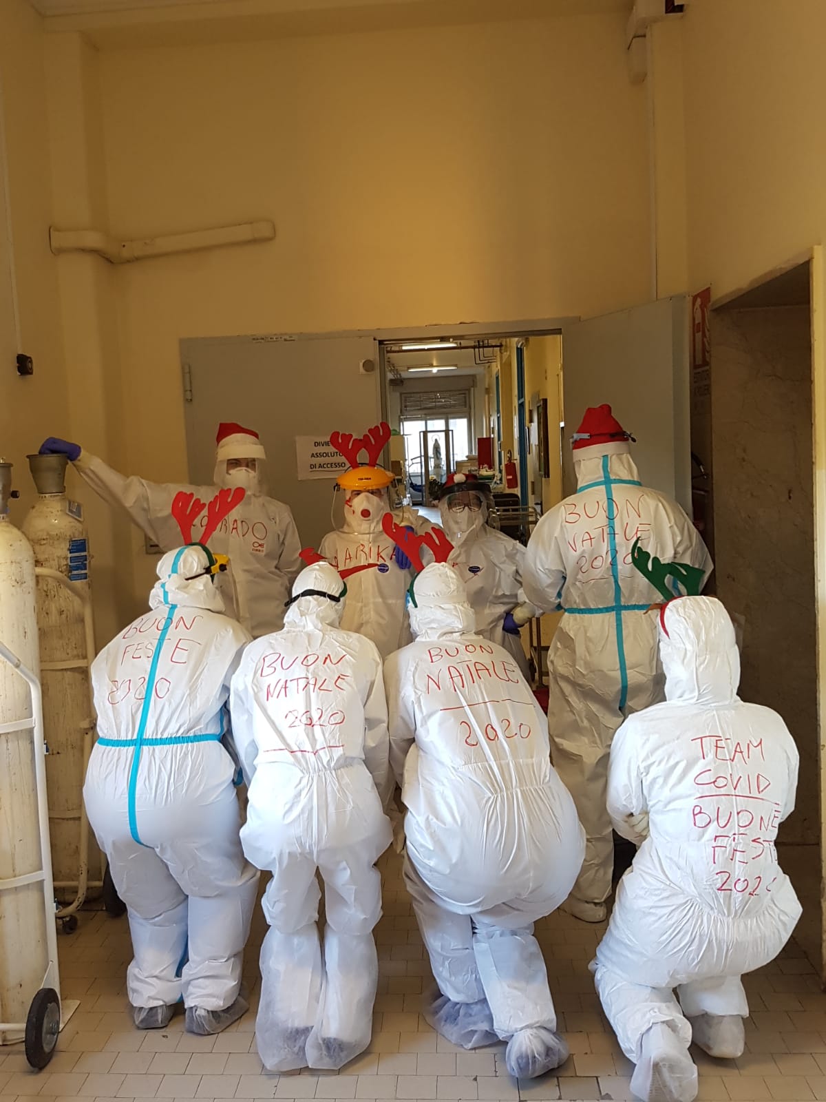 Sopra le visiere hanno indossato il cappello di Babbo Natale o le orecchie da renna. Sulle tute, oltre ai nomi, hanno scritto gli auguri per i pazienti di Malattie infettive. «Volevamo dimostrare il nostro affetto», spiegano. Guarda le foto
