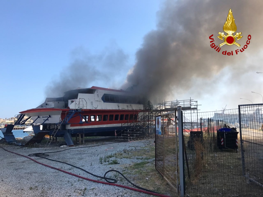 Milazzo, in fiamme relitto dell’aliscafo Mostaccio Rogo divampato mentre gli operai lo demolivano