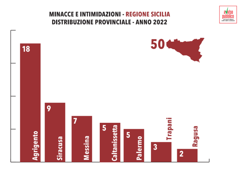 In Sicilia sono 34 i Comuni colpiti, distribuiti in sette province: nell’Agrigentino sono quindici i Comuni coinvolti (Aragona, Bivona, Burgio, Calamonaci, Canicattì, Lampedusa, Licata, Menfi, Montevago, Naro, Ribera, Santa Margherita di Belice, Sciacca, Scicli e Siculiana); sette quelli del Siracusano (Siracusa, Augusta, Floridia, Pachino, Portopalo di Capo Passero, Priolo e Rosolini); quattro i comuni del Palermitano in cui gli amministratori sono finiti sotto tiro (Palermo, Bompietro, Petralia Soprana e San Cipirello); tre nel Messinese (Messina, Barcellona Pozzo di Gotto e Santa Maria Salina); due rispettivamente in provincia di Ragusa (Pozzallo e Vittoria) e di Trapani (Castelvetrano ed Erice); in provincia di Caltanissetta l’unico caso è quello di Gela. Nel report non compaiono casi avvenuti nel 2022 nelle province di Catania ed Enna. Dopo la Sicilia si sono posizionate al Campania (con 49 casi), la Puglia (48) e la Calabria (42). «Se uno guarda la distribuzione regionale – ha detto il ministro dell’Interno Matteo Piantedosi nel corso della presentazione del report Amministratori sotto tiro – è evidente come il tema della connessione con la criminalità organizzata sia strutturale. Noi questi fenomeni li rileviamo soprattutto nelle regioni del Sud ad alta densità mafiosa».