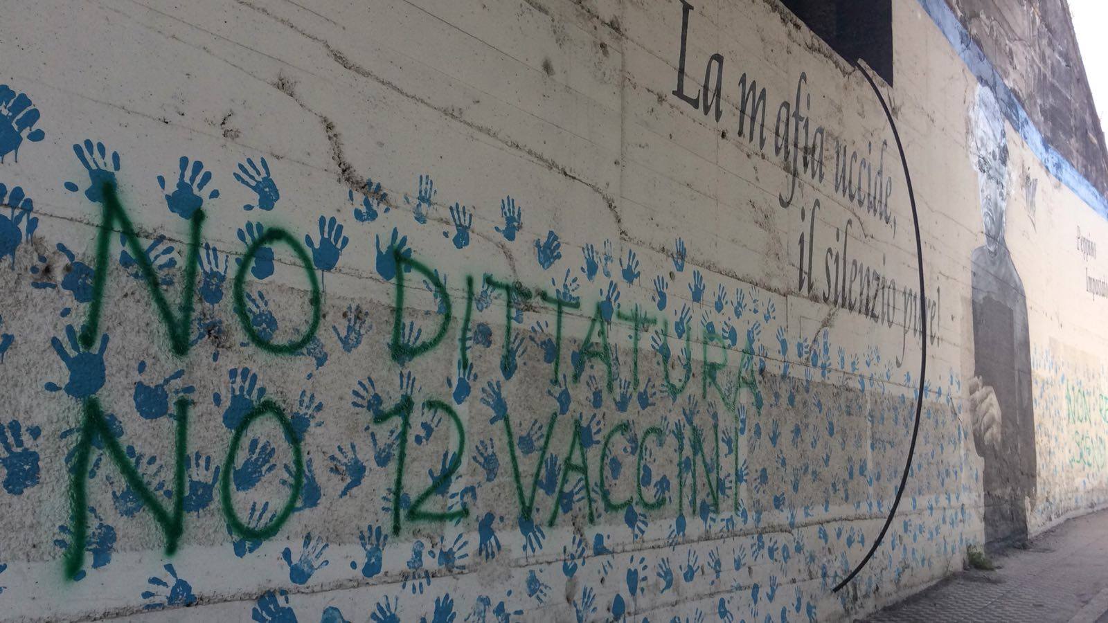«No dittatura, no 12 vaccini». Sotto alla scritta «La mafia uccide, il silenzio pure» che fa bella mostra di sé accanto al ritratto di Peppino Impastato oggi ne è apparsa un’altra. Bomboletta spray verde, lettere in stampatello e un chiarissimo messaggio antivaccinista a deturpare un’opera la cui storia – dall’idea alla realizzazione – non è stata semplice. «Questo murales non trova pace», sospira Riccardo Foti, oggi 19enne, che nel 2015 era stato tra i promotori di un’iniziativa nata tra le mura del liceo scientifico Galileo Galilei e, all’epoca, al centro di un’accesa polemica tra gli studenti e la preside dell’istituto. «Sono andato a vedere intorno a ora di pranzo – racconta Foti – Fino a ieri sera certamente era tutto normale. Ci passo quasi ogni giorno e mi giro sempre a guardarlo, perché tengo molto a quel lavoro».