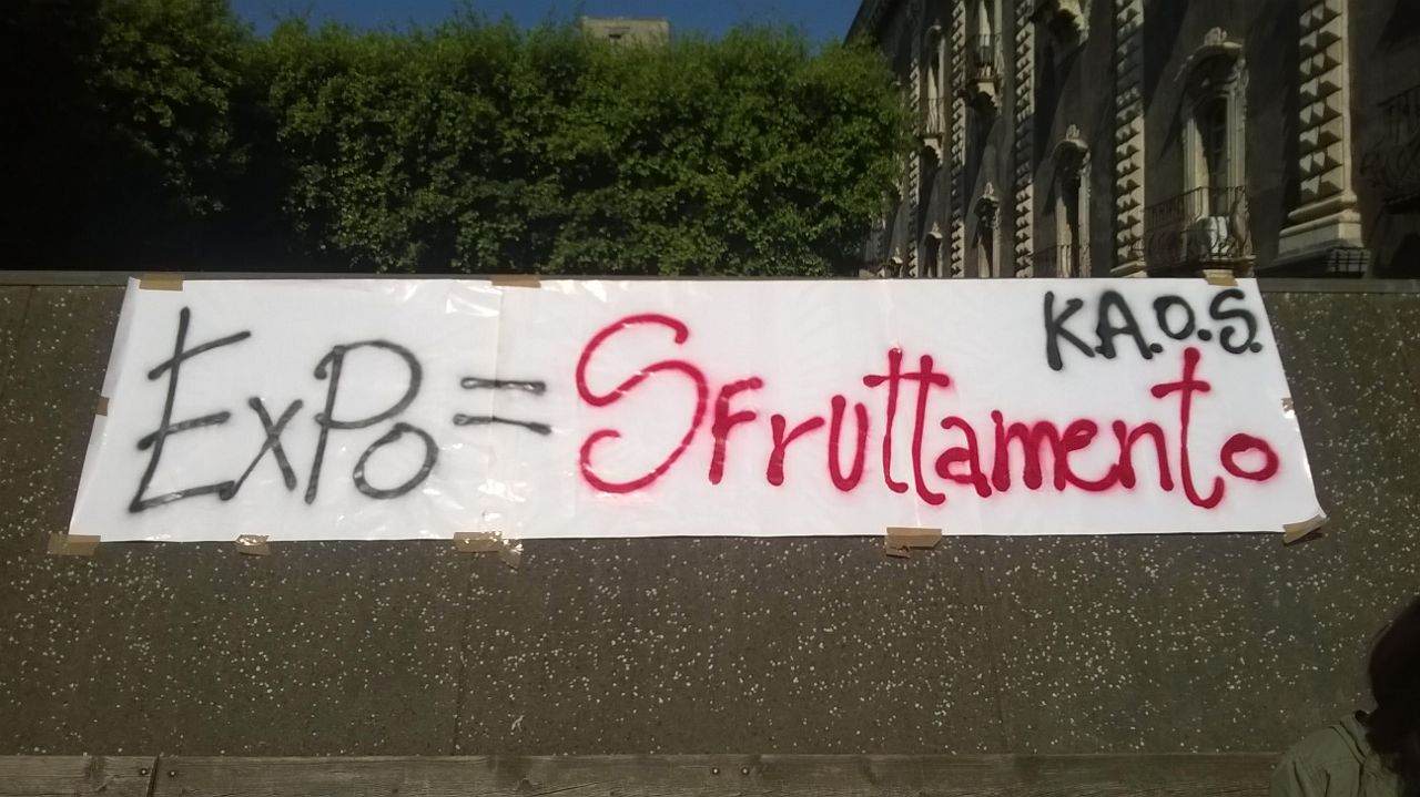 La grande inaugurazione di Expo 2015 è fissata per domani. Per questo la giornata nazionale di mobilitazione contro l’esposizione universale di Milano è stata fissata per oggi. E anche gli studenti dell’università di Catania hanno deciso di aderire. Con striscioni di protesta in ogni dipartimento e un’assemblea alle 15 nella sede di Agraria, in via Santa Sofia. «Expo = sfruttamento», dice uno degli slogan, affisso nel cortile dell’ex Monastero dei Benedettini. Ma altri sono stati appesi a Medicina, Fisica e Agraria.