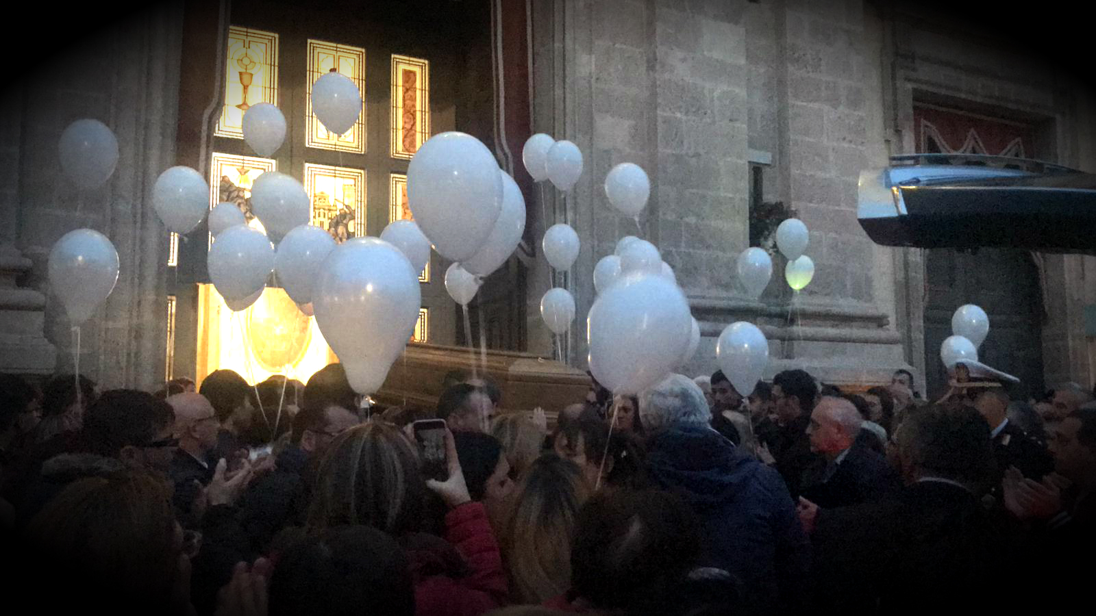 «Alla domanda sul perché del male e della sofferenza non riusciamo a dare molte risposte». È uno dei passaggi dell'omelia di padre Enzo Algieri dal pulpito dell'edificio ecclesiastico paternese. All'esterno decine di palloncini bianchi. Guarda le foto