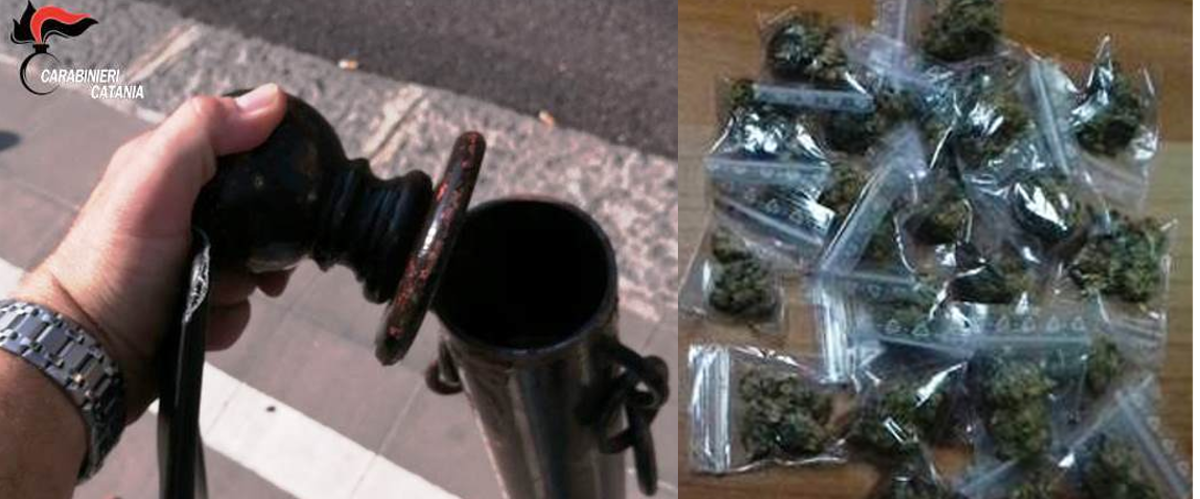 Il paletto, smontabile nella parte superiore come dimostra una foto, e alto poco più di un metro, permetteva ai pusher di sfruttare il tubo. Dentro, i carabinieri del nucleo investigativo del reparto operativo di Catania, hanno trovato 25 dosi di marijuana per un peso complessivo di trenta grammi. In manette sono finiti Mario Minuto, 39 anni, Salvo Lagati, 23 anni e Alfio Puglisi, 30 anni. Tutti accusati di detenzione ai fini di spaccio di sostanze stupefacenti.