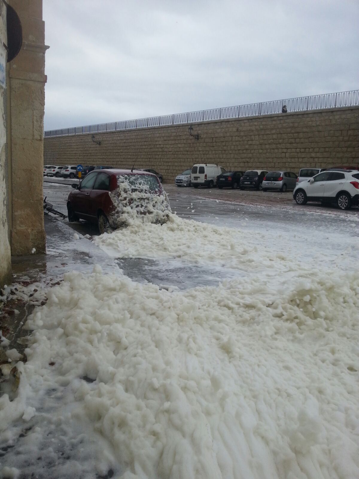 Il forte vento sta colpendo la Sicilia orientale. In particolare a Siracusa le onde e una densa schiuma hanno raggiunto la strada. Secondo l'Agenzia regionale per la protezione ambientale «è dovuta alla mucillagine, un'eccessiva concentrazione di microalghe». Guarda video e foto