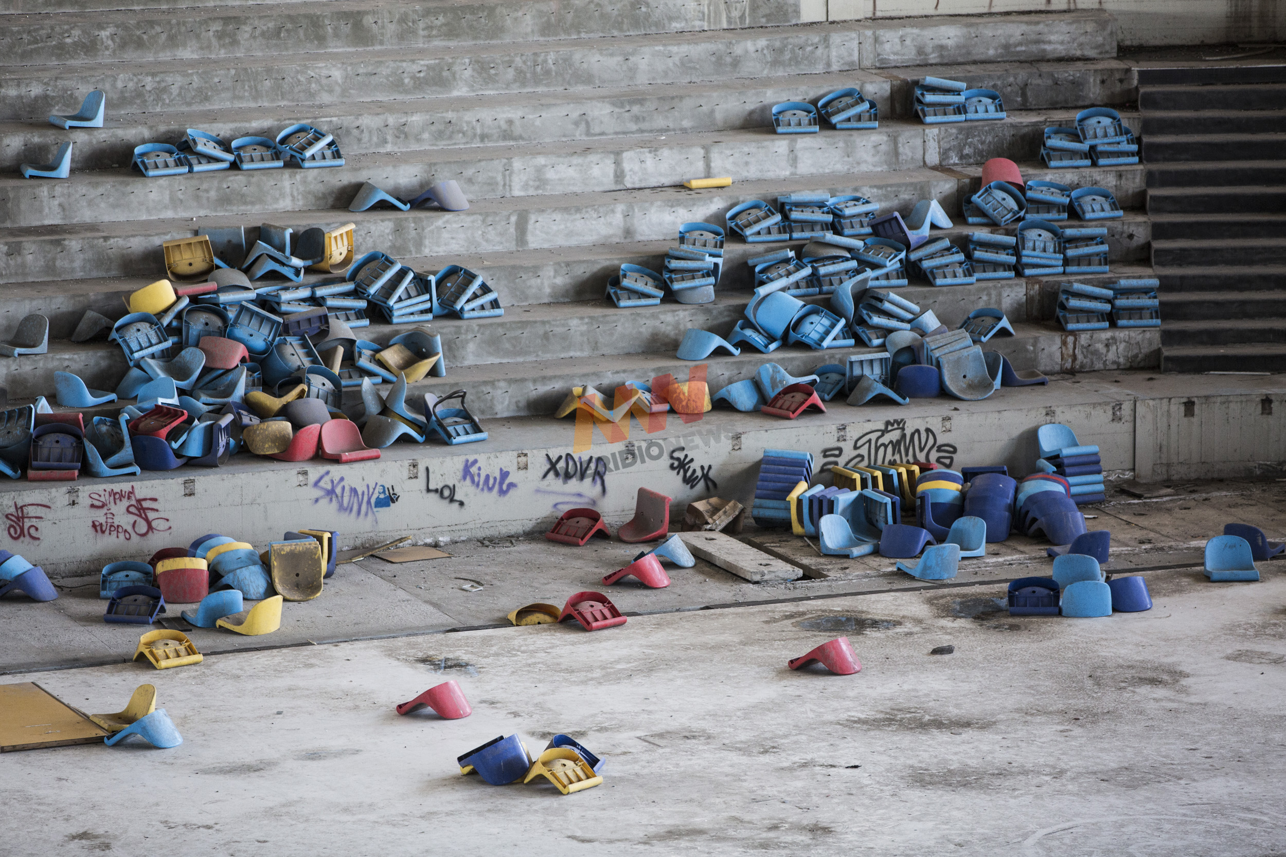 Oggi, entrando nel palazzetto, ormai privo di una recinzione completa ed efficace, risulta difficile immaginarla funzionante, con il chiasso della folla, potenti fari che illuminano il campo e un’accesa competizione. All’interno si trovano solo tombini divelti, resti di guaine dei cavi elettrici rubati, cabine elettriche svuotate, vetri rotti, scritte sui muri e cumuli di macerie qua e là. In altre parole, i pochi componenti che non sono stati rubati. All’esterno si formano anche delle mini discariche.