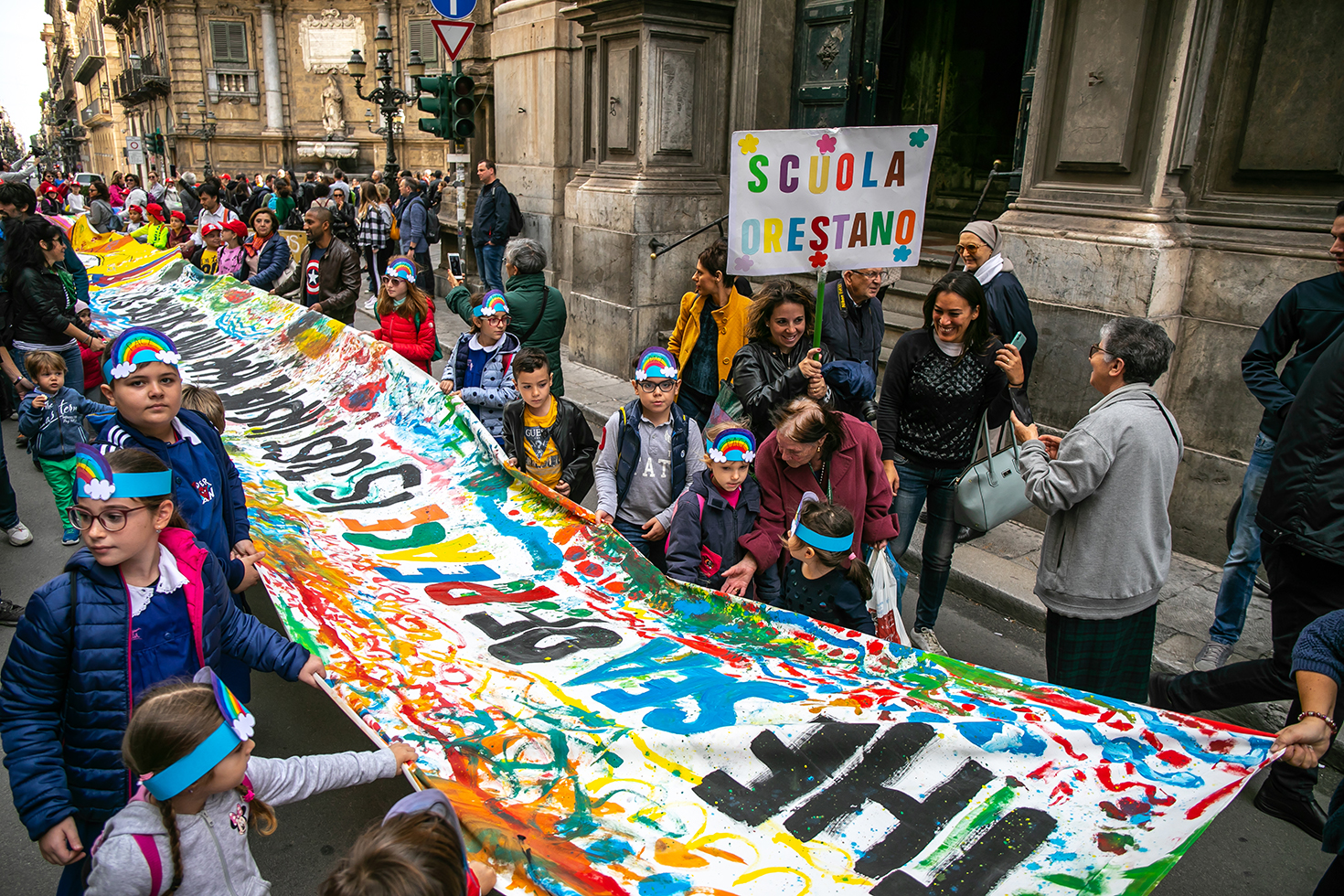 Centinaia di bambini hanno partecipato alla tappa conclusiva della Peace Run portando in corteo, dal Palazzo di Città sino a Palazzo dei Normanni, il telo della pace più lungo d’Italia con i suoi 160 metri di telo colorato. Ad aprire il corteo la banda musicale del Liceo Regina Margherita e a seguire la la fiaccola della pace, che è stata tra le mani dei più importanti leader del mondo come Nelson Mandela, portata con orgoglio dalla piccola Giorgia.