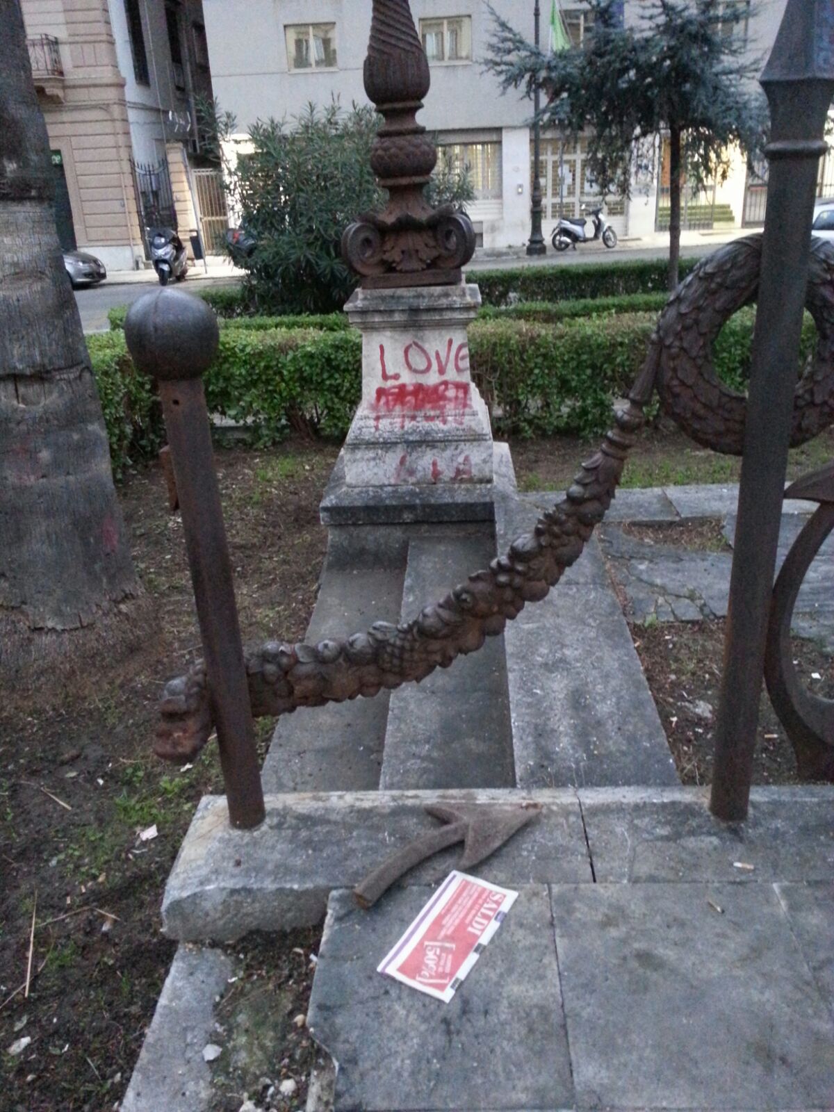 Una situazione di degrado e inciviltà denunciata da Maurizio Alesi Consigliere dell’ottava circoscrizione, che ha presentato una mozione per il recupero della villetta «lastricata di rifiuti abbandonati da chissà quanto tempo». Ma non è tutto: «Per terra giacciono persino grossi pezzi dell’antica ringhiera in ferro battuto che cinge la statua – conclude – ovviamente imbrattata di vernice».