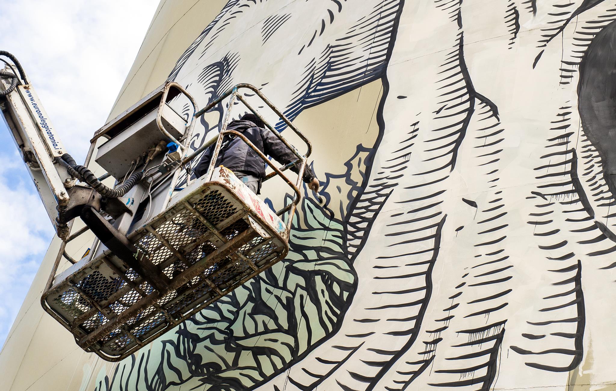 Terminati i lavori sui serbatoi. All'opera due artisti: il portoghese Vhils ha colorato il volto del contadino che guarda il mare. Il romano Luca Maleonte ha finito l'ultimo contenitore, che invece affaccia sulla città. Ci ha dipinto un'opera ispirata all'albero di Sant'Alfio. Il 16 l'inaugurazione. Guarda le foto