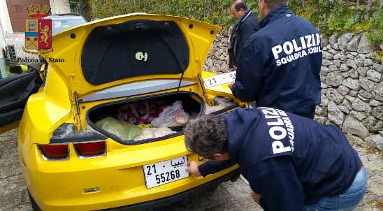 Sono stati fermati a bordo di una lussuosa auto sportiva due cittadini stranieri. Entrambi erano in possesso di documenti con timbri libici e maltesi. Il viaggio, ricostruito dalla polizia, seguiva una insolita triangolazione mediterranea. Le autorità mantengono il più stretto riserbo sulle indagini. Guarda foto e video