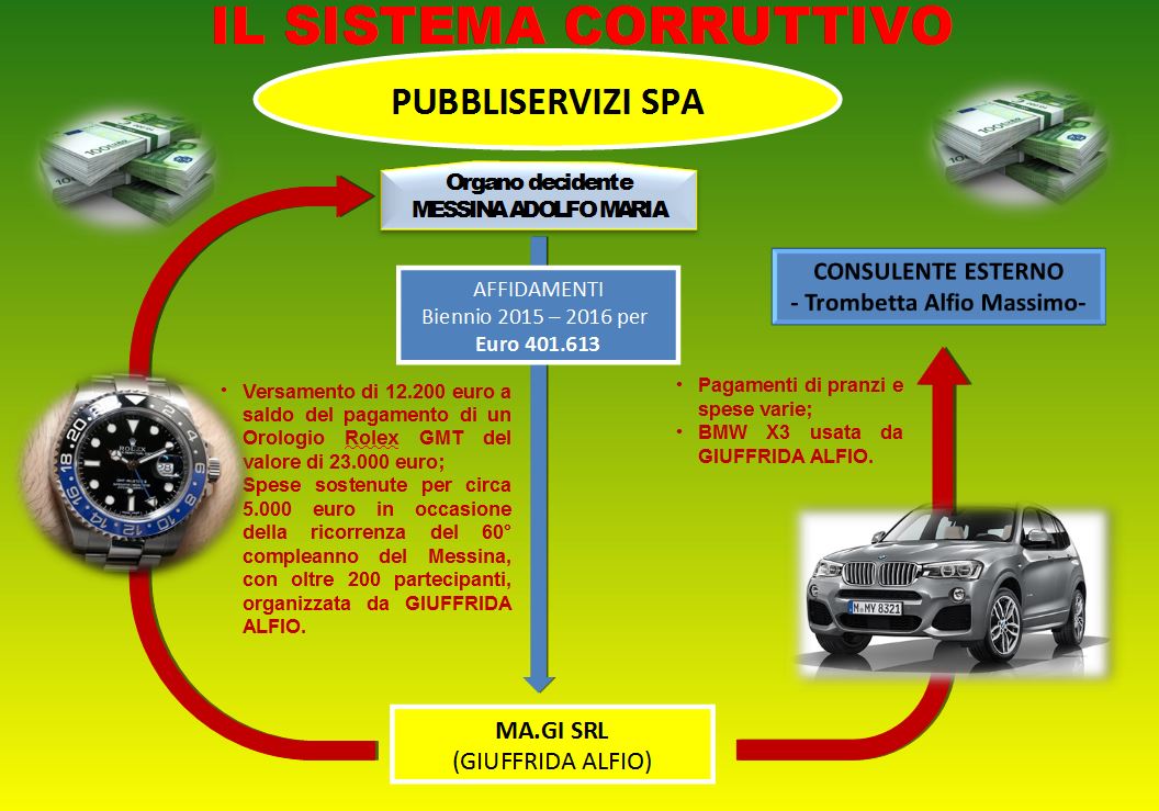 A parlare, nella conversazione succitata, è l’imprenditore di Trecastagni Alfio Giuffrida, attivo nel settore dell’edilizia. Secondo gli investigatori, avrebbe regalato a Trombetta una Bmw X3. Uno dei doni in cambio dei quali, per i magistrati, Giuffrida avrebbe ottenuto i favori dei vertici di Pubbliservizi, di cui Trombetta era consulente a titolo gratuito. «Fatti fare quattro assegni di mille euro, io non li verso… Però al più presto tu, a cinquecento euro al colpo – continua l’imprenditore parlando con l’altro arrestato – Ci vuole la tracciabilità di dove li ho presi». «Va bene – replica Trombetta – Ora ti faccio due righe dove tu mi hai venduto la macchina. Un atto privato tra le parti, io che ti saldo a trecento euro al mese».