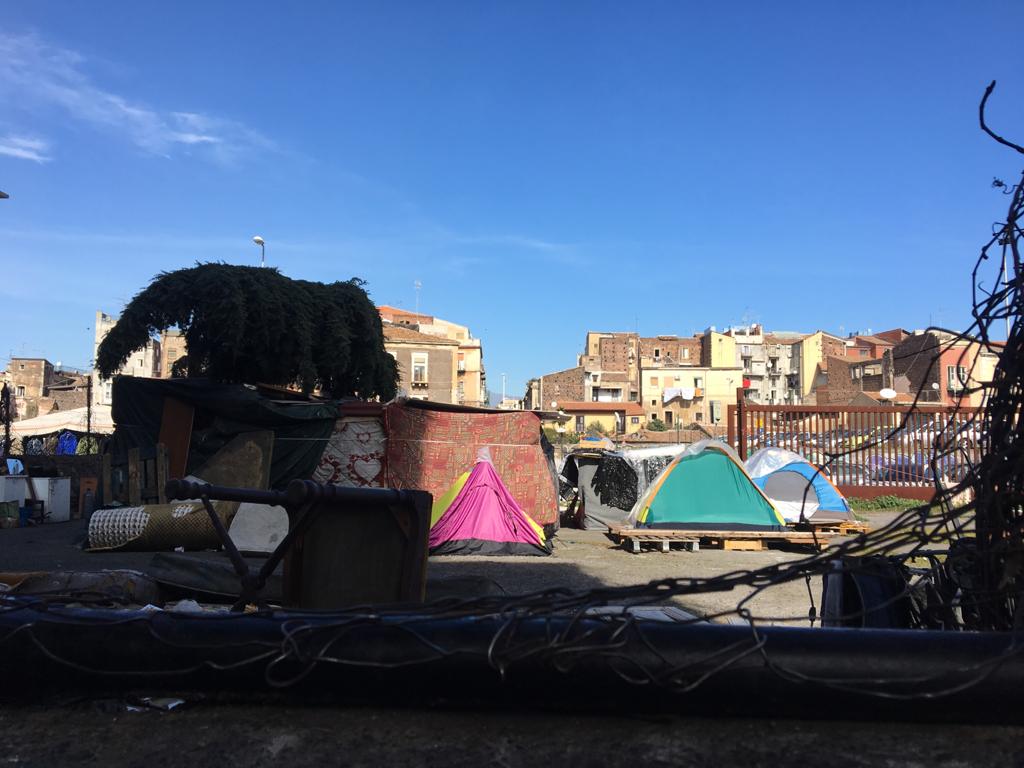 Tende da campeggio montate sopra a pedane di legno, lenzuoli, cartoni e pezzi di compensato fungono da pareti di baracche improvvisate, c’è qualche materasso appoggiato a terra, alcune sedie riparate alla buona e anche due poltrone sistemate davanti a una tenda. «Io sto qui da circa otto mesi – racconta in un ottimo italiano il giovane a MeridioNews – Prima non avevo un posto fisso in cui vivere, stavo in giro per la città». Riparati da un muro alto e da una rete di recinzione, in quell’area «di solito siamo dalle otto alle 15 persone, tutti africani arrivati per lo più dalla Nigeria e dal Senegal».