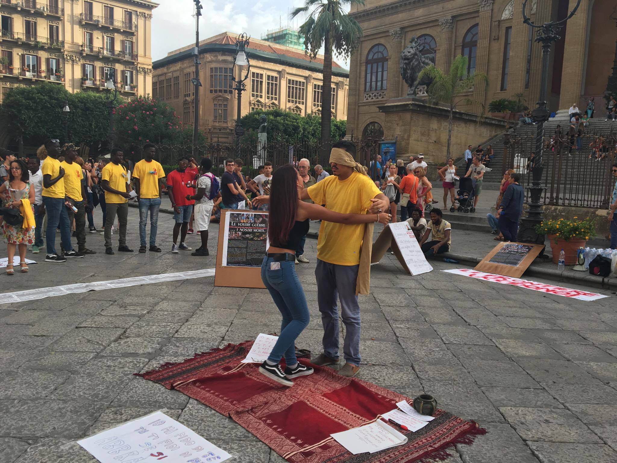 Un abbraccio contro la paura, il contatto umano contro la fobia del terrorismo islamista, l’empatia contro la diffidenza verso lo straniero: un certo tipo di extracomunitario, così come raccontato da molti media, non certo il facoltoso turista ma il musulmano tout court, senza distinzioni. Fa ancora discutere la performance di Rabia Bouallegue, palermitano nato da genitori tunisini, che sabato scorso – alla mobilitazione antirazzista a piazza Verdi – ha scelto di bendarsi per aprire «le braccia e il cuore verso Palermo». Due fogli spiegavano poi il senso del gesto: in quello a destra c’era scritto «Sono musulmano e mi hanno etichettato come terrorista» e in quello a sinistra «Io mi fido di te, tu ti fidi di me? Se si, abbracciami».